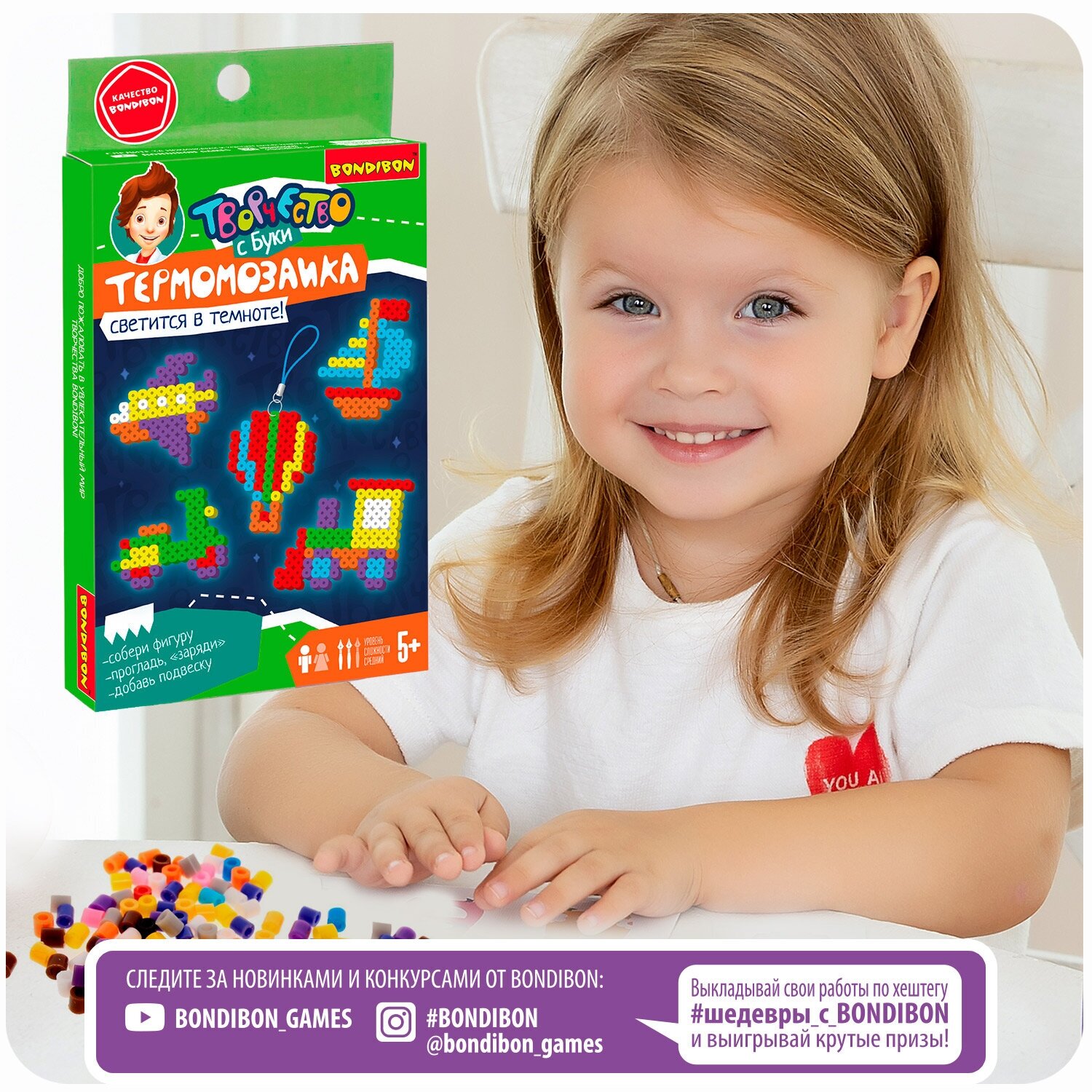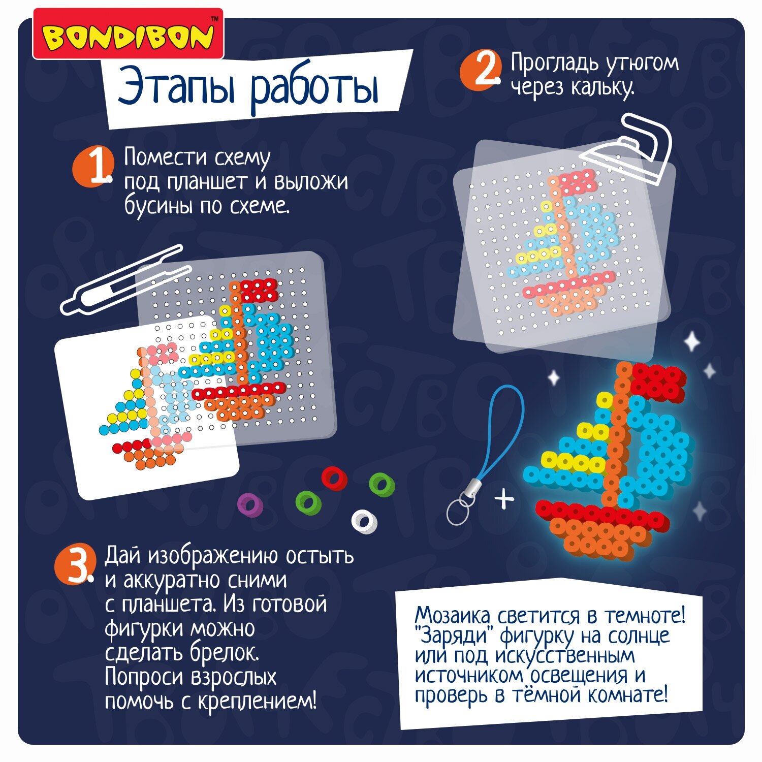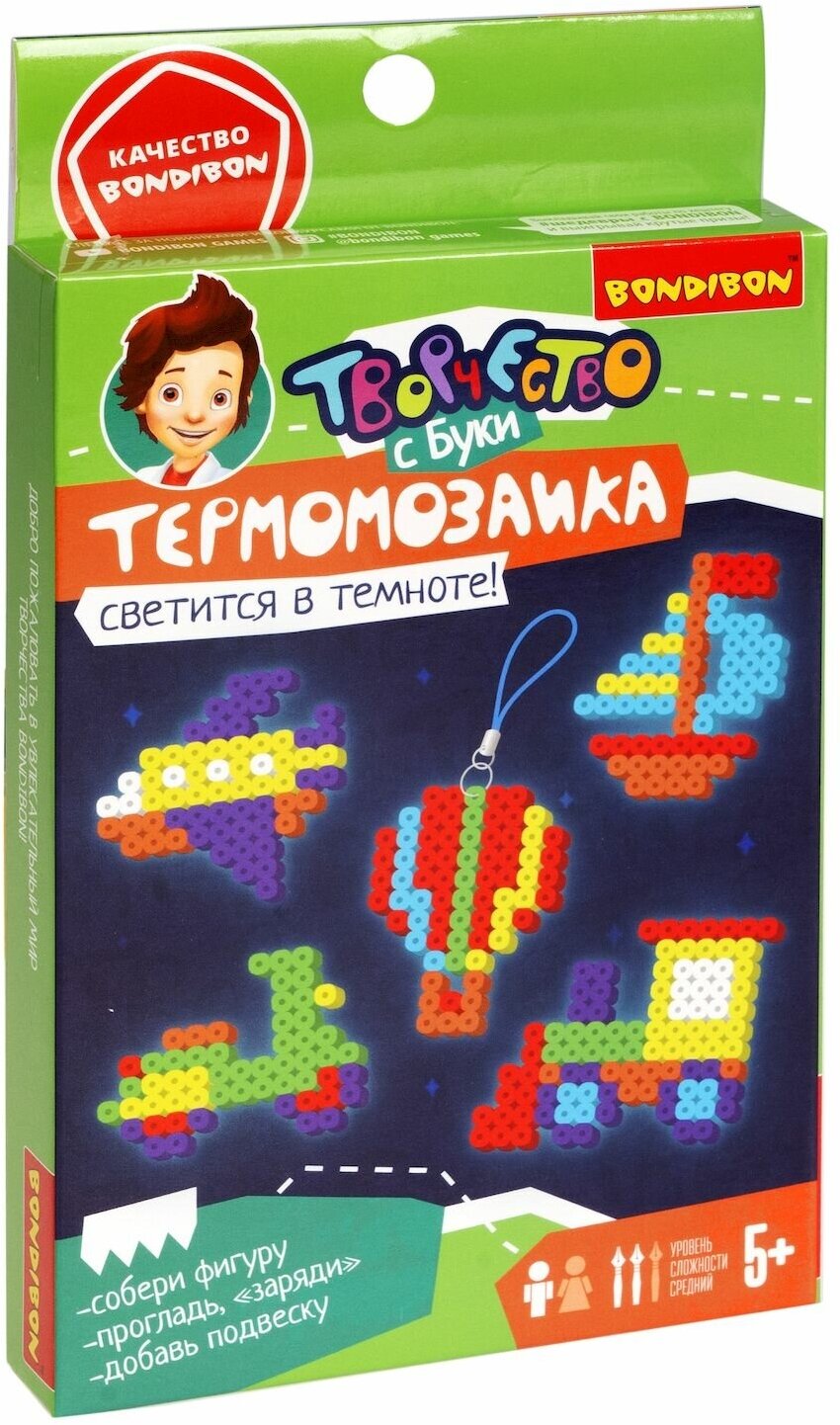 Термомозаика от Bondibon - увлекательный творческий набор для мальчиков и девочек! Из цветных пластиковых бусин создаются различные фигурки довольно необычным способом. Фигурку необходимо собрать на форме-планшете и прогладить через кальку утюгом. Обработка горячим расплавит бусинки и скрепит их между собой. Фигурка остынет и с ней можно играть!