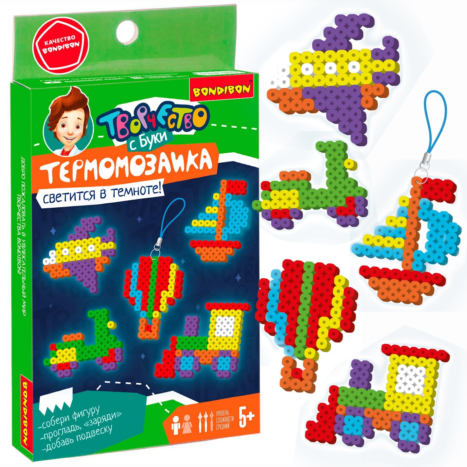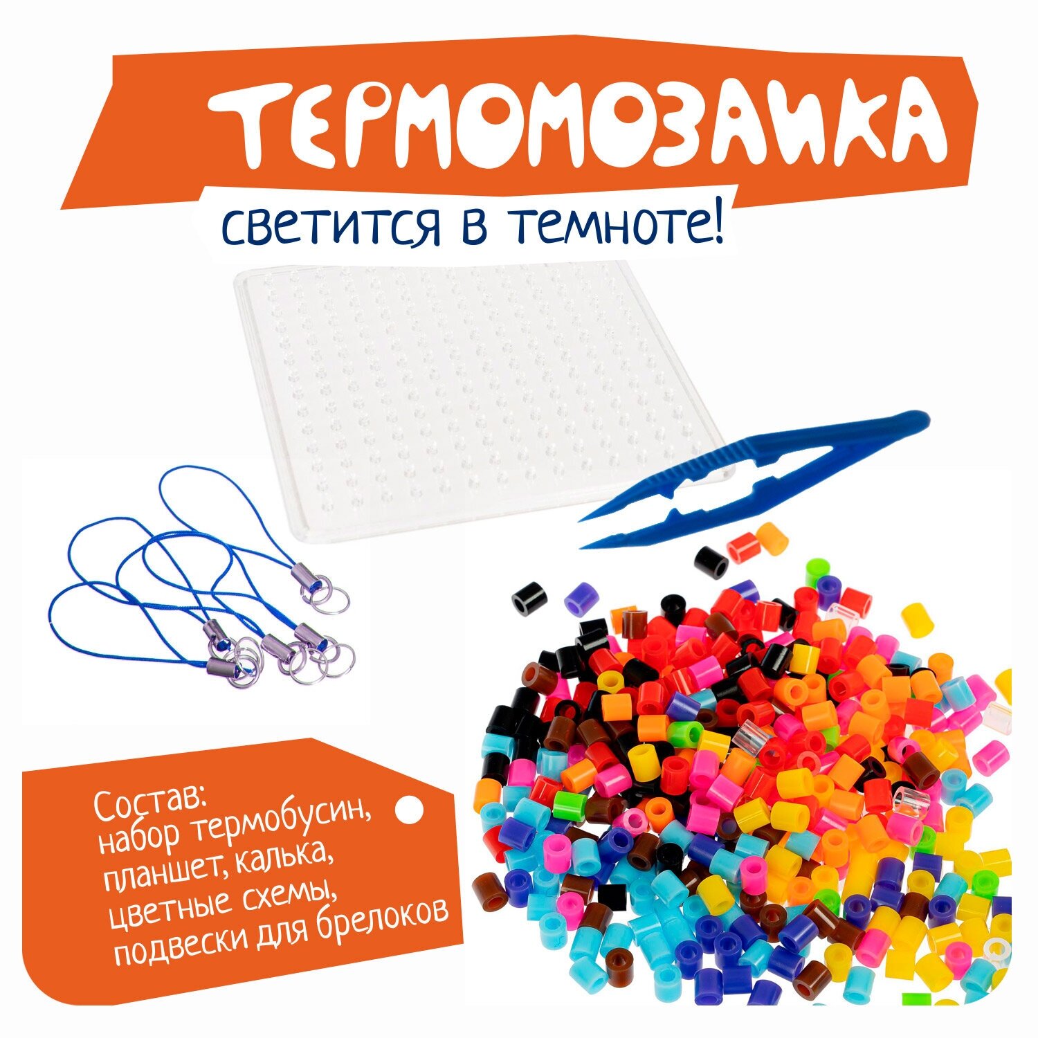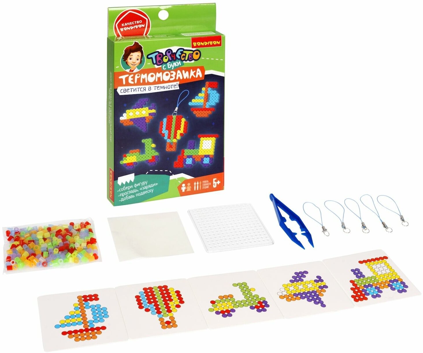 В комплекте: набор неоновых термобусин, планшет, калька, пинцет, подвески для брелоков, 5 цветных схем - паровоз, кораблик, самолет, самокат, воздушный шар.