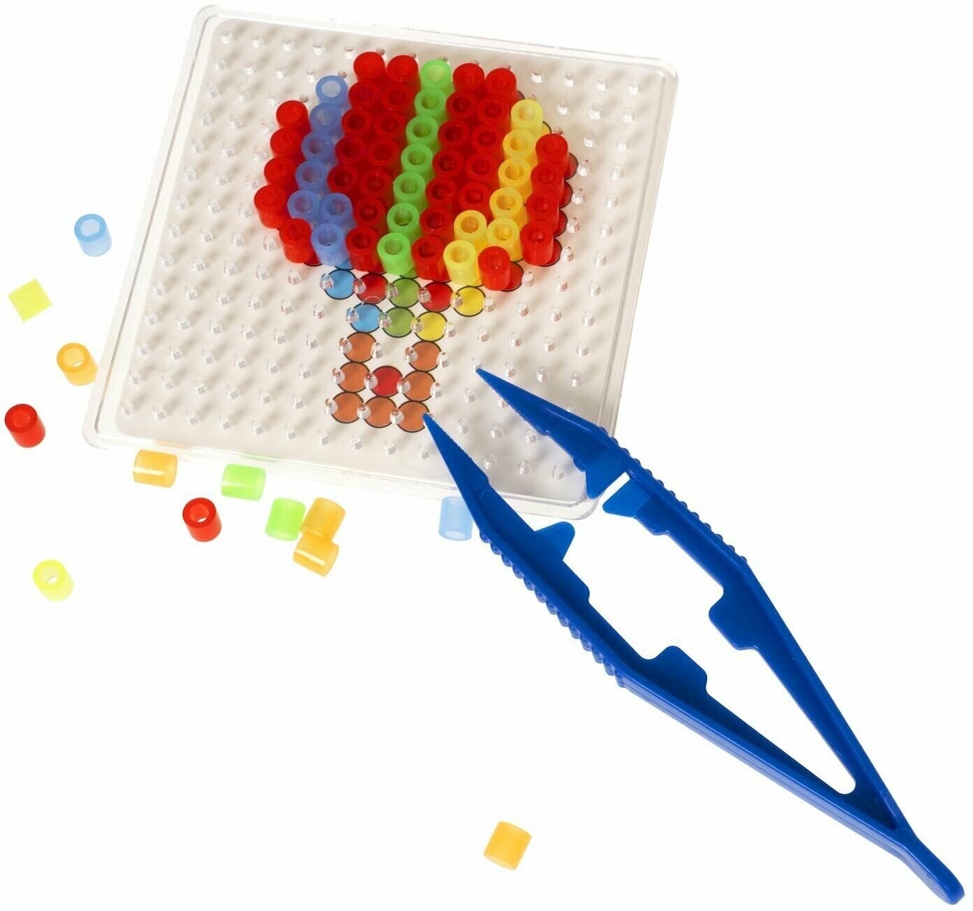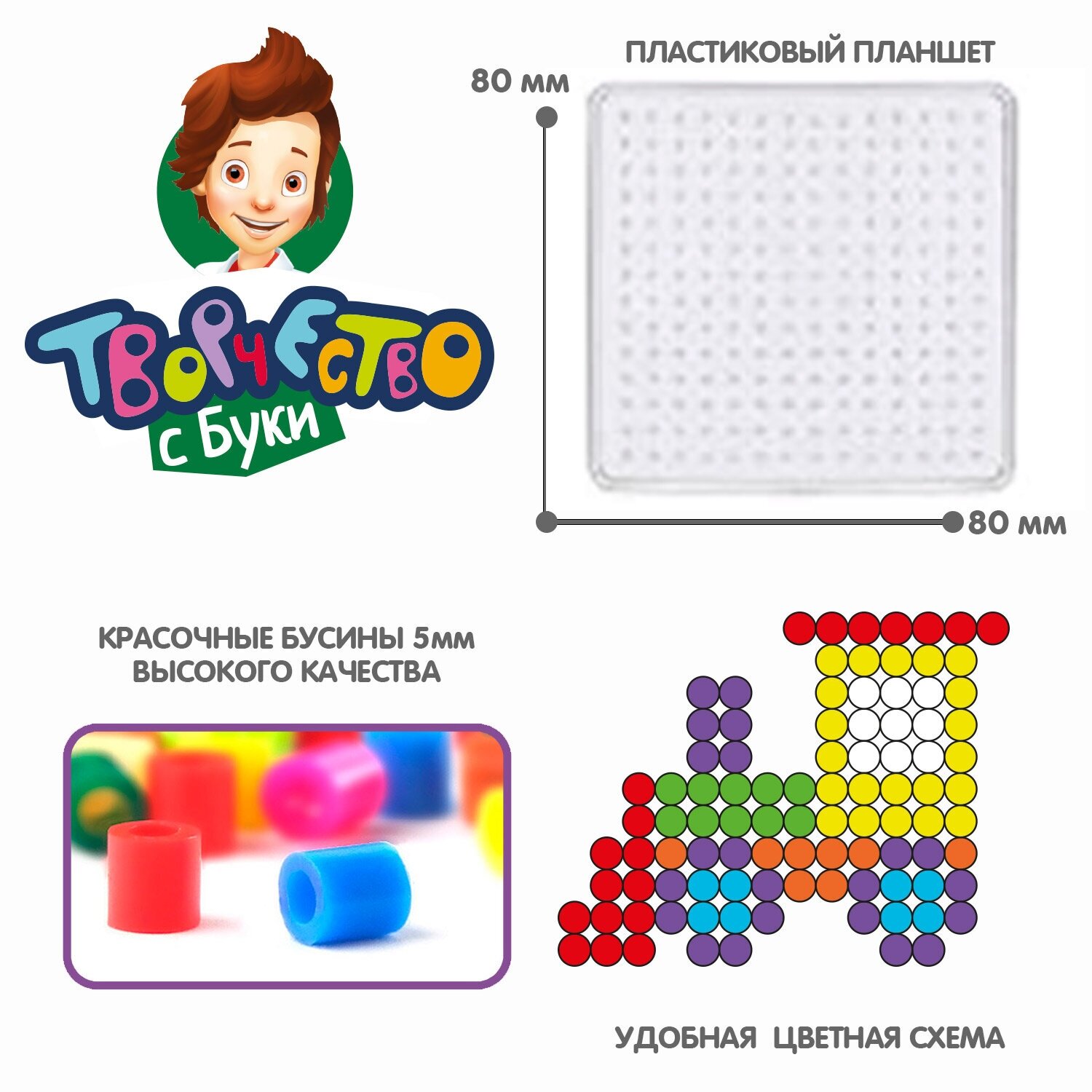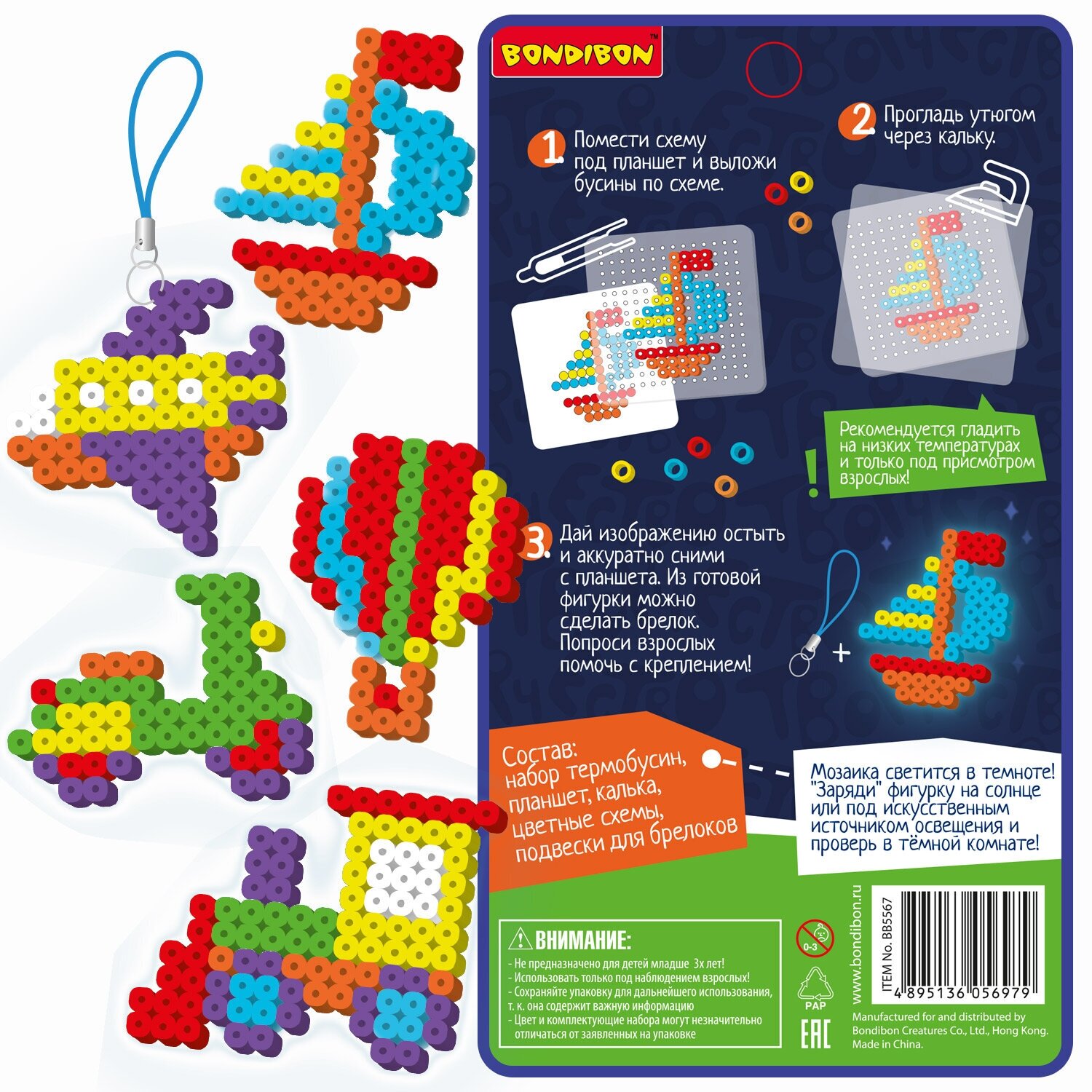 В комплекте: набор неоновых термобусин, планшет, калька, пинцет, подвески для брелоков, 5 цветных схем - паровоз, кораблик, самолет, самокат, воздушный шар.