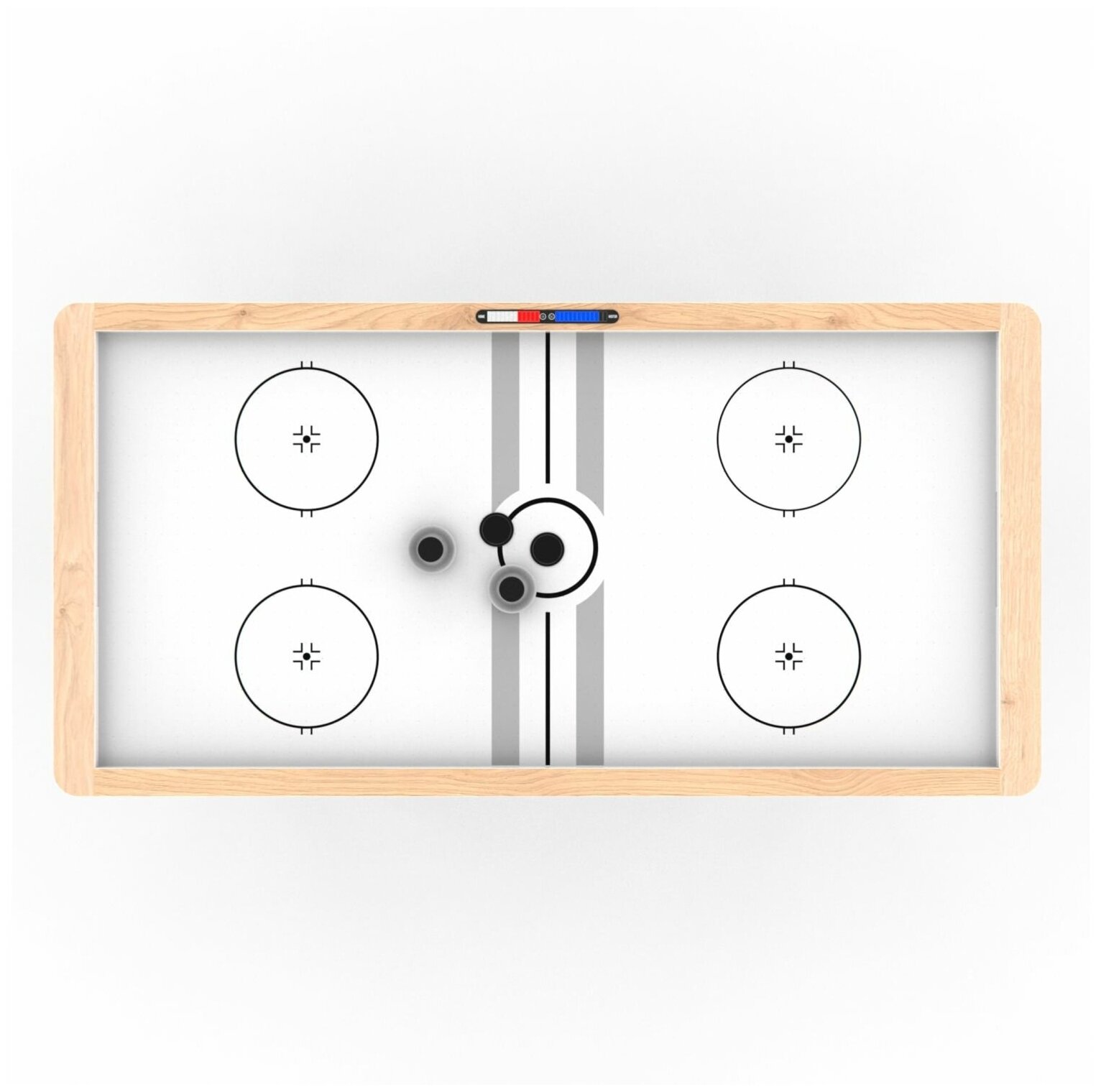 Размер стола: 213,5 x 106,7 x 81,3 см. В комплект входят 2 биты и 2 шайбы, электронный счётчик очков и блок питания, работающий от батареек типа АА (не входят в комплект). Ножки стола можно отрегулировать по высоте, если необходимо компенсировать неровность пола. Вентилятор работает от сети 220 вольт.