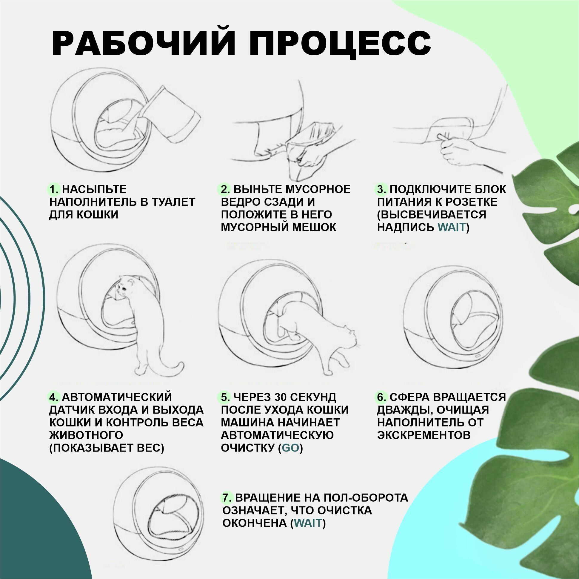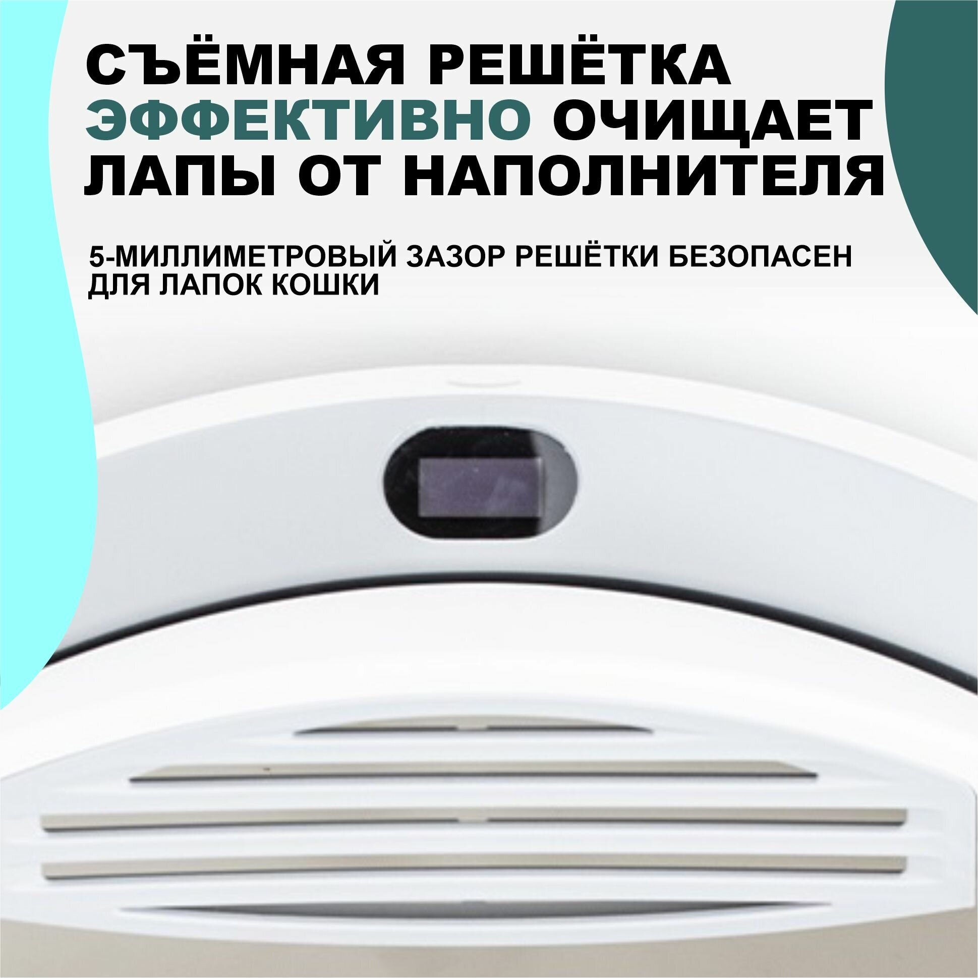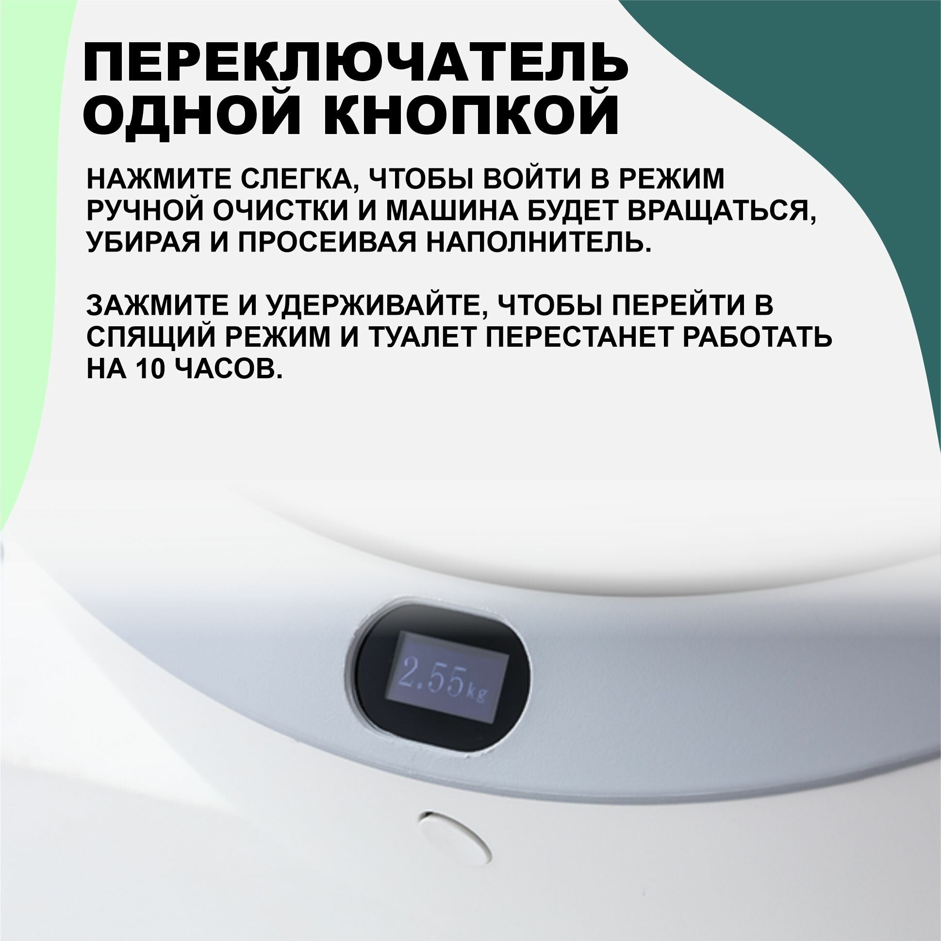 Автоматический туалет для кошек среднего и крупного размера.Встроенный датчик веса автоматически определяет, что ваш питомец закончил свои дела, и примерно через минуту включает барабан, пересыпающий содержимое лотка в сетку, через которую обратно в лоток попадает чистый наполнитель. Отходы задерживаются на сетке и ссыпаются в контейнер в задней части устройства.ВНИМАНИЕ: датчик веса не способен обнаружить животное весом менее 1,5 кг, поэтому барабан не будет автоматически вращаться после использования туалета котёнком!Четырёхлитровый контейнер для отходов, расположенный в задней части устройства блокирует все неприятные запахи, легко вынимается и чистится. Объёма контейнера хватает в среднем на две недели использования. Для правильной работы устройства необходимо использовать комкующийся наполнитель.Избавляет от неприятных запахов в квартире Барабан при вращении не шумит и не доставляет неудобств вам и вашим питомцам. Уровень шума менее 50 ДцбВсе элементы выполнены из безопасного для здоровья нетоксичного полипропилена Вращающийся барабан легко извлекается и чистится Дисплей, расположенный в нижней части устройства, показывает вес содержимого барабана и режим работы устройства Кнопка, расположенная под дисплеем, позволяет переводить устройство в спящий режим