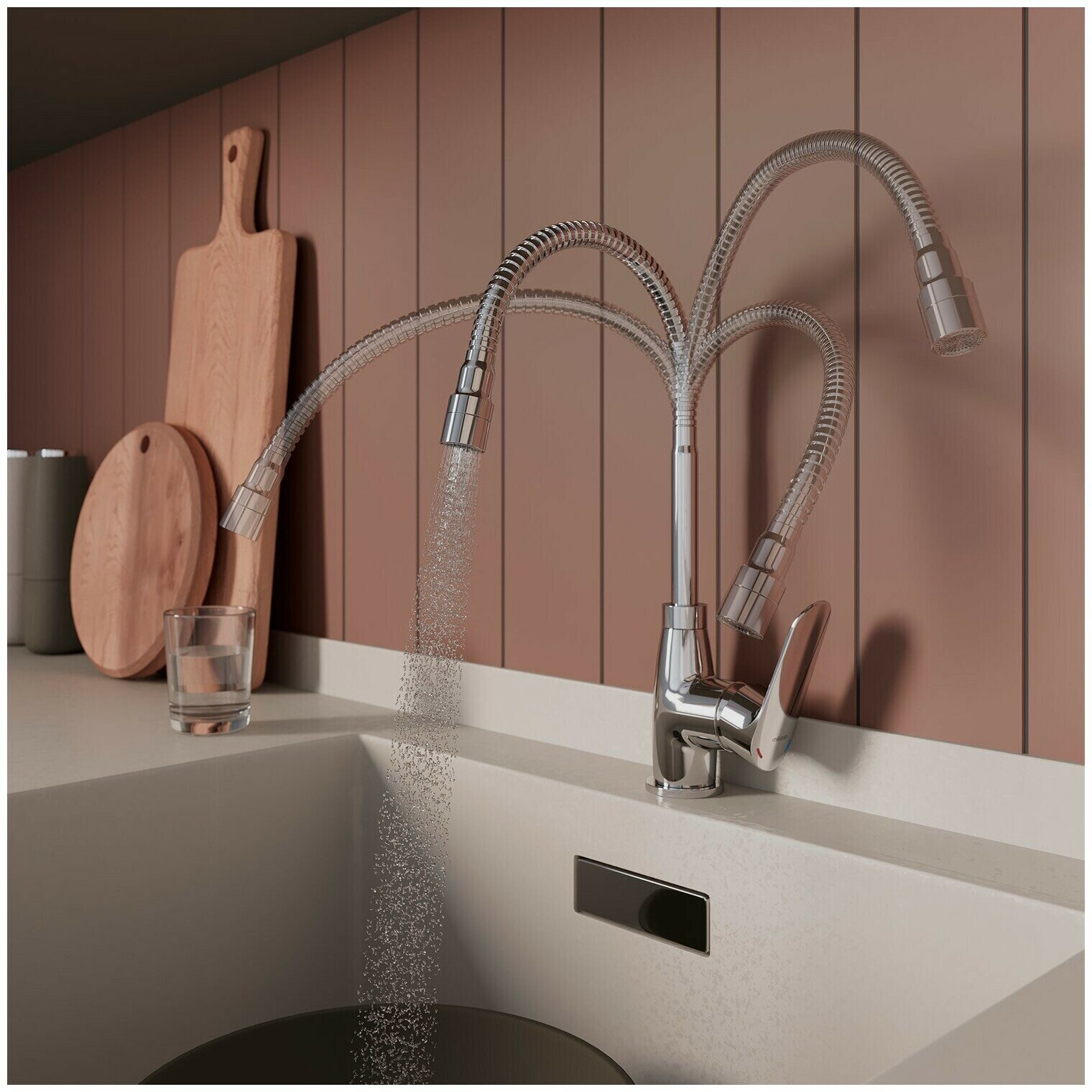 Хромированный смеситель из коллекции Meal – демократичное решение для современной кухни с высокой функциональностью. Излив смесителя гнется в любом направлении, помогая дотянуться до самых труднодоступных уголков мойки и поверхностей за ее пределами. Двухрежимная душевая насадка позволяет мыть посуду, фрукты и овощи, наполнять емкости с большим удобством. Переключение между режимами происходит путем простого прокручивания основания насадки. • Качественный механизм смешивания воды смесителя Milardo® рассчитан на более чем 70 000 циклов работы – это не менее 15 лет эксплуатации семьей из трех человек. • Оптимальная толщина никель-хромового покрытия защищает смеситель от образования трещин и сколов, продлевает срок его службы. • Гибкая подводка и крепеж идут в комплекте.