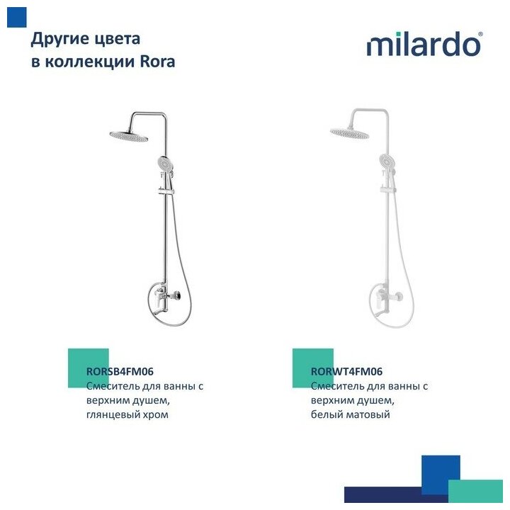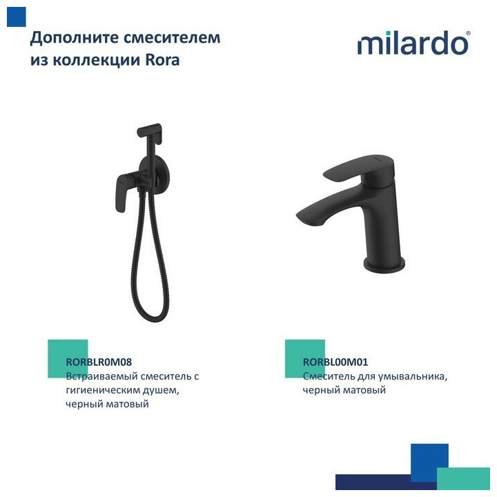 Смеситель для ванны Rora отличается универсальным характером: основной акцент в его дизайне приходится на плавные линии корпуса и трендовый черный цвет. Большой диаметр (o 250 мм) верхней лейки способствует равномерному распределению струи. Увеличенный вынос верхнего душа (400 мм) дарит максимальную свободу движений. Поворотный излив эстетично встроен в корпус, вода из него поступает в ванну под комфортным углом. • 3-режимная ручная лейка (o 120 мм) с держателем, душевой шланг (1,5 м), штанга для душа с возможностью регулировки по высоте и крепеж идут в комплекте. • Качественный механизм смешивания воды смесителя Milardo рассчитан на более чем 70 000 циклов работы – это не менее 15 лет эксплуатации семьей из трех человек. • Электрофоретическое матовое покрытие делает поверхность смесителя устойчивой к условиям высокой влажности – такой смеситель прослужит дольше и сохранит свой первоначальный внешний вид. • Гарантия на смесители Milardo– 7 лет, на картридж – 3 года, на душевые аксессуары – 1 год.