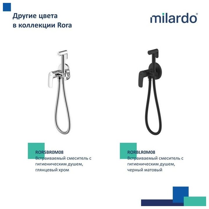 Смеситель с гигиеническим душем Rora отличается универсальным характером: основной акцент в его дизайне приходится на плавные линии корпуса и трендовый черный цвет. Держатель для лейки интегрирован в компактный корпус смесителя – удобно для санузлов небольшой площади. Простое рычажное управление позволяет управлять смесителем в одно движение. • Гигиеническая лейка из ABS-пластика и душевой шланг из ПВХ (1,5 м) идут в комплекте.• Качественный механизм смешивания воды смесителя Milardo® рассчитан на более чем 70 000 циклов работы – это не менее 15 лет эксплуатации семьей из трех человек. • Электрофоретическое матовое покрытие делает поверхность смесителя устойчивой к условиям высокой влажности – такой смеситель прослужит дольше и сохранит свой первоначальный внешний вид. • Гарантия на смесители Milardo® – 7 лет, на картридж – 3 года, на душевые аксессуары – 1 год.