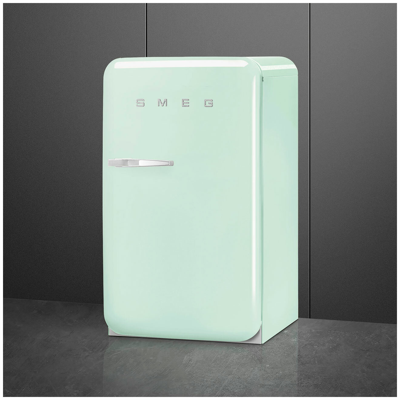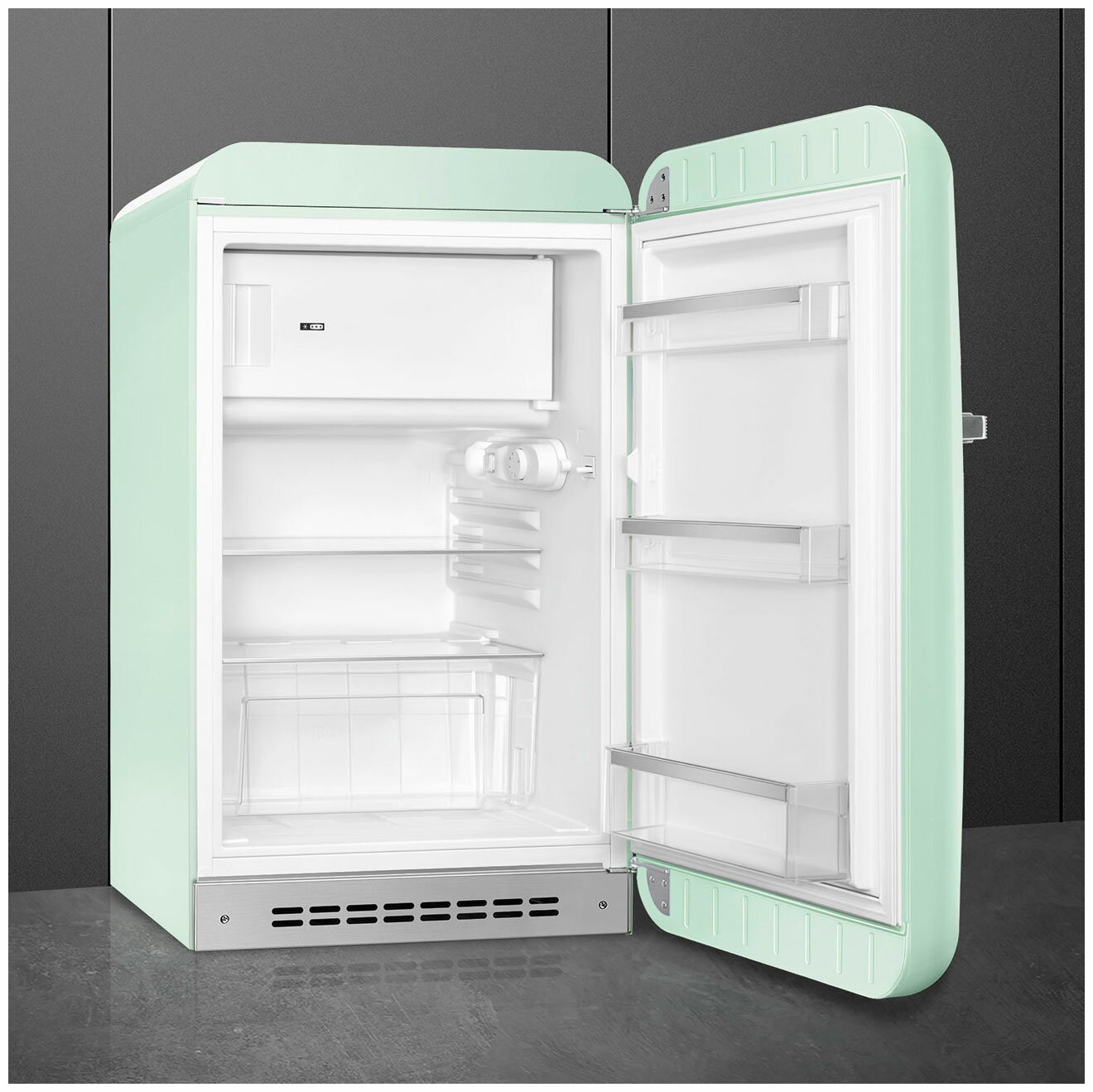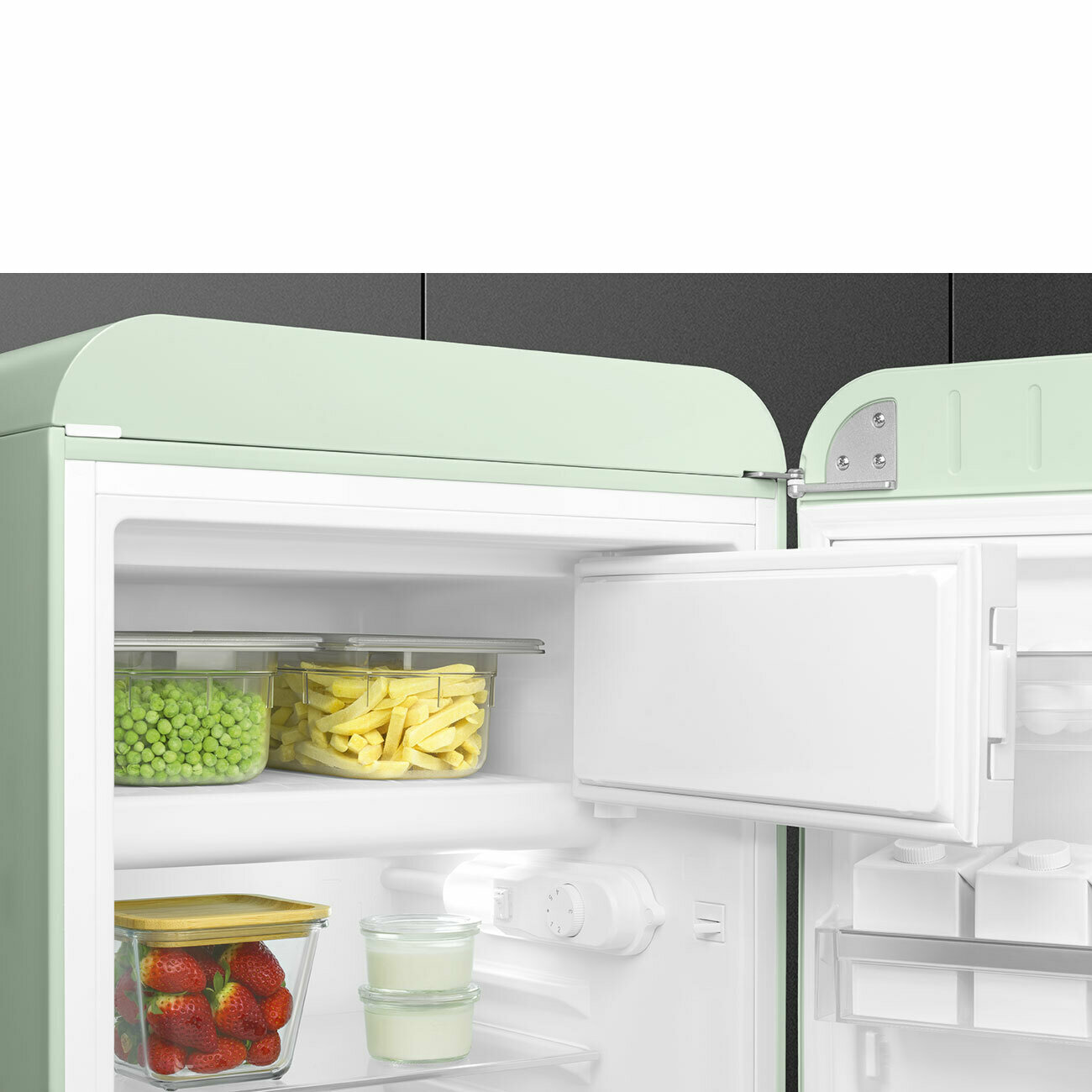 Отдельностоящий холодильник производится в Италии из долговечных и экологичных материалов. Модель в стиле ретро отлично впишется в интерьер классической кухни. Корпус салатового цвета гармонично сочетается с хромированной ручкой и логотипом бренда. Холодильная камера объемом 105 литров отличается продуманным зонированием. Регулируемые по высоте полки, ящики и подставки обеспечивают комфортное размещение еды и напитков. Сверху предусмотрена компактная морозилка вместительностью 17 литров. Продукты замораживаются со скоростью 2,6 кг в сутки. Дверной упор по умолчанию расположен справа.