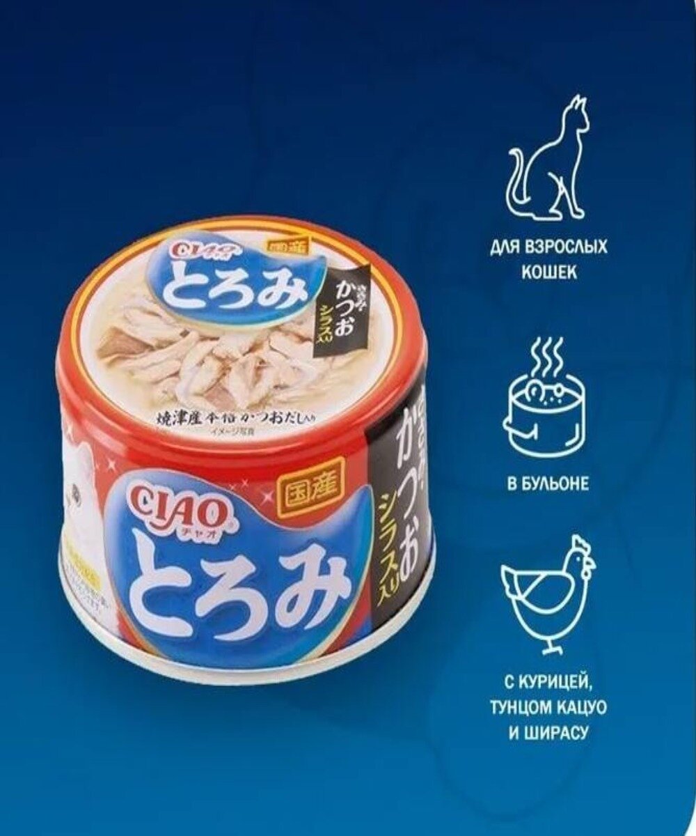 Суперпремиальный влажный корм для кошек Ciao Toromi (ЧАО ТОРОМИ) от японского производителя Inaba приготовлен на основе нежного куриного филе, кусочков глубоководного тунца и насыщенного фирменного бульона. Корма и лакомства Inaba отличаются высоким качеством и неповторимым вкусом, ведь они изготавливаются на основе отборных традиционных японских ингредиентов! Во все продукты добавлен экстракт зеленого чая, который, благодаря содержанию катехина, обладает нейтрализующим действием на запах содержимого кишечника. Корм обогащён витамином Е - натуральным антиоксидантом, поддерживающим иммунную систему, не содержит искусственных добавок, красителей и консервантов.