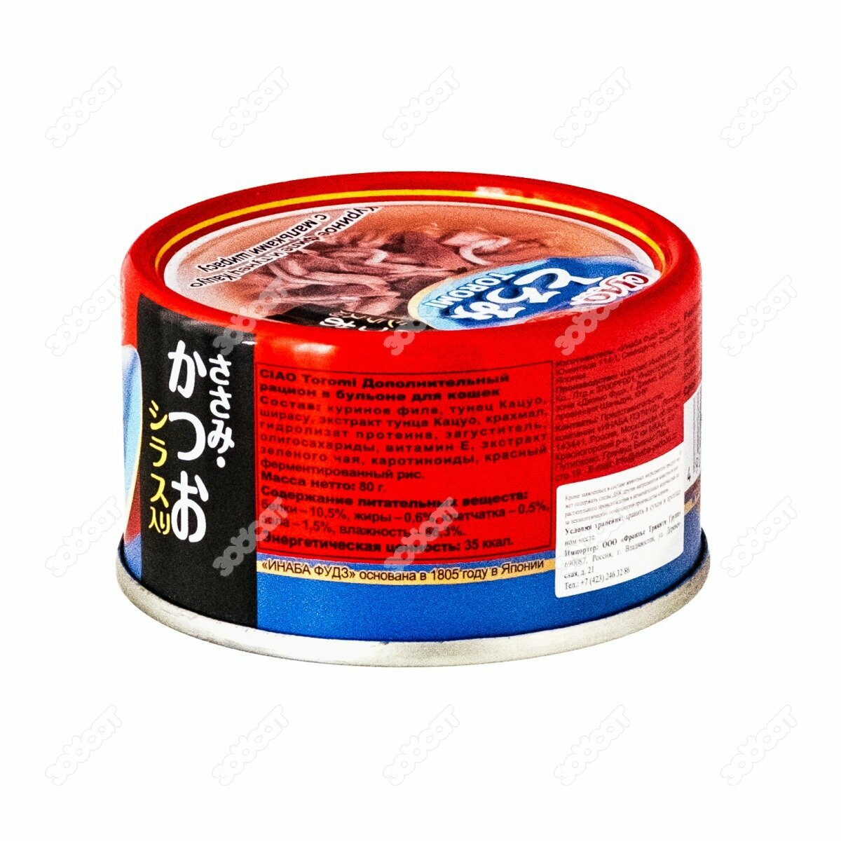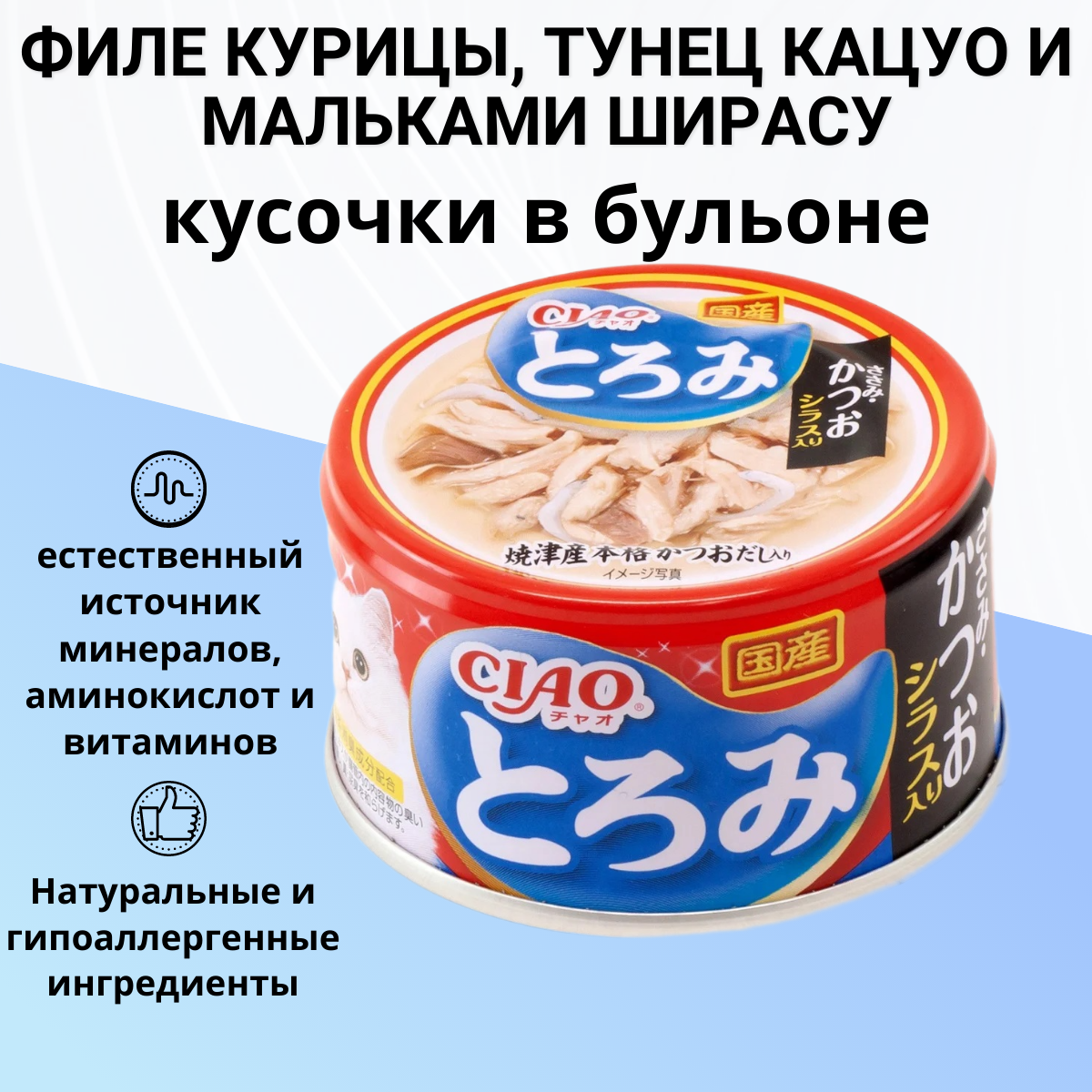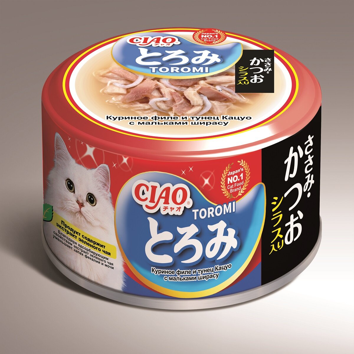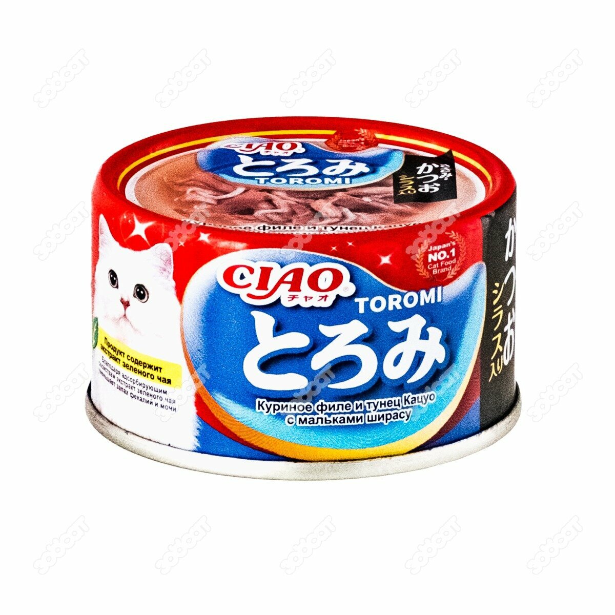 INABA CIAO TOROMI Корм влаж.куриное филе с тунцом кацуо и мальками ширасу д/кошек конс.80г (139.1127)