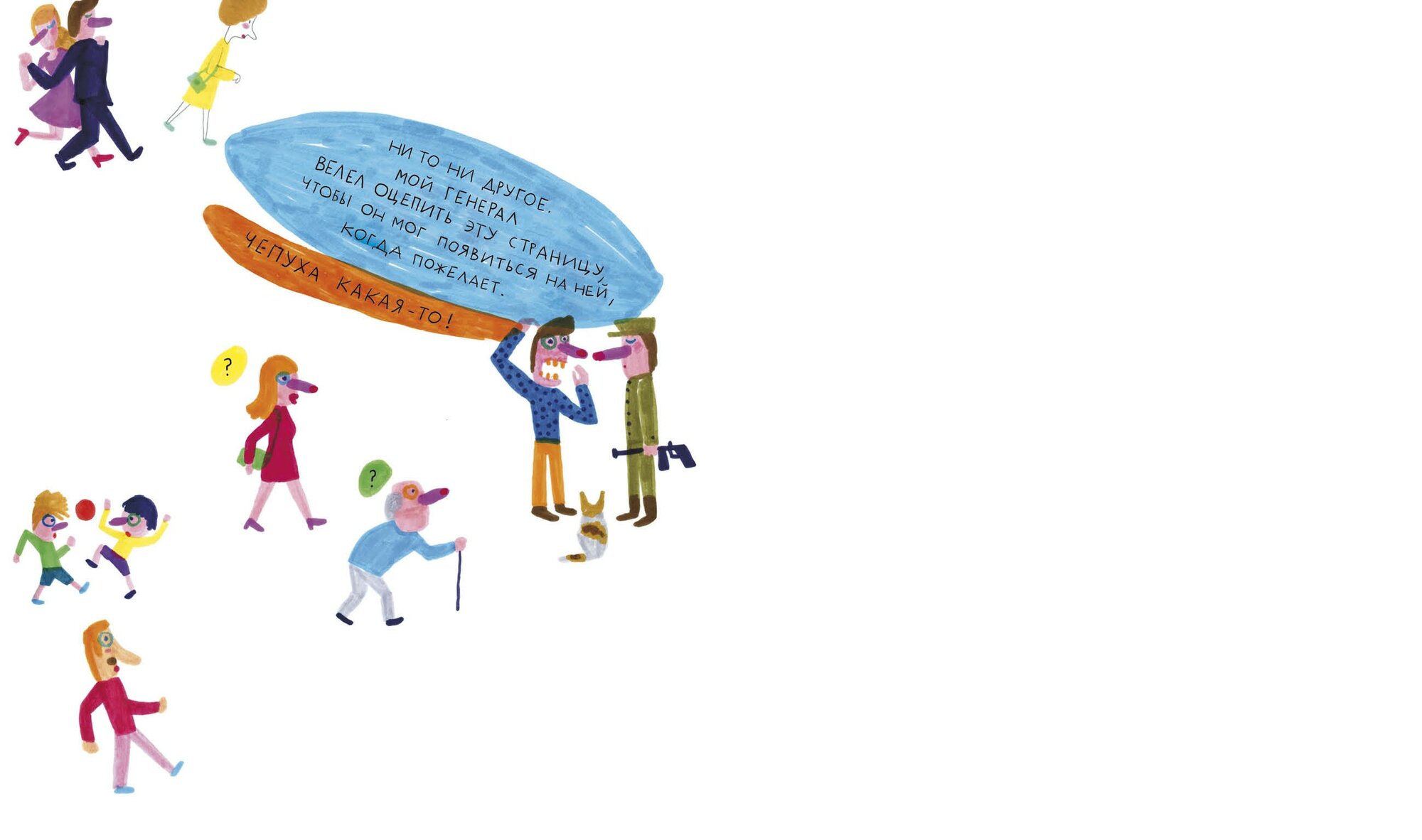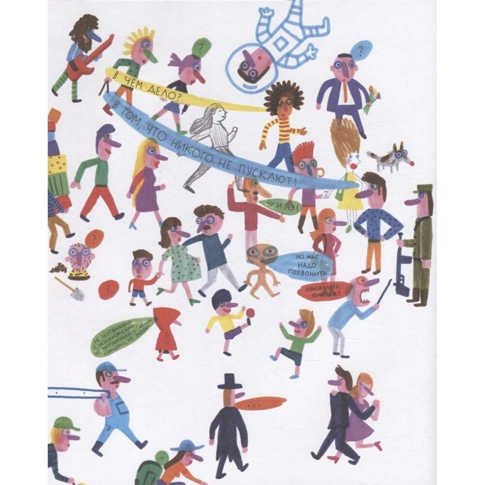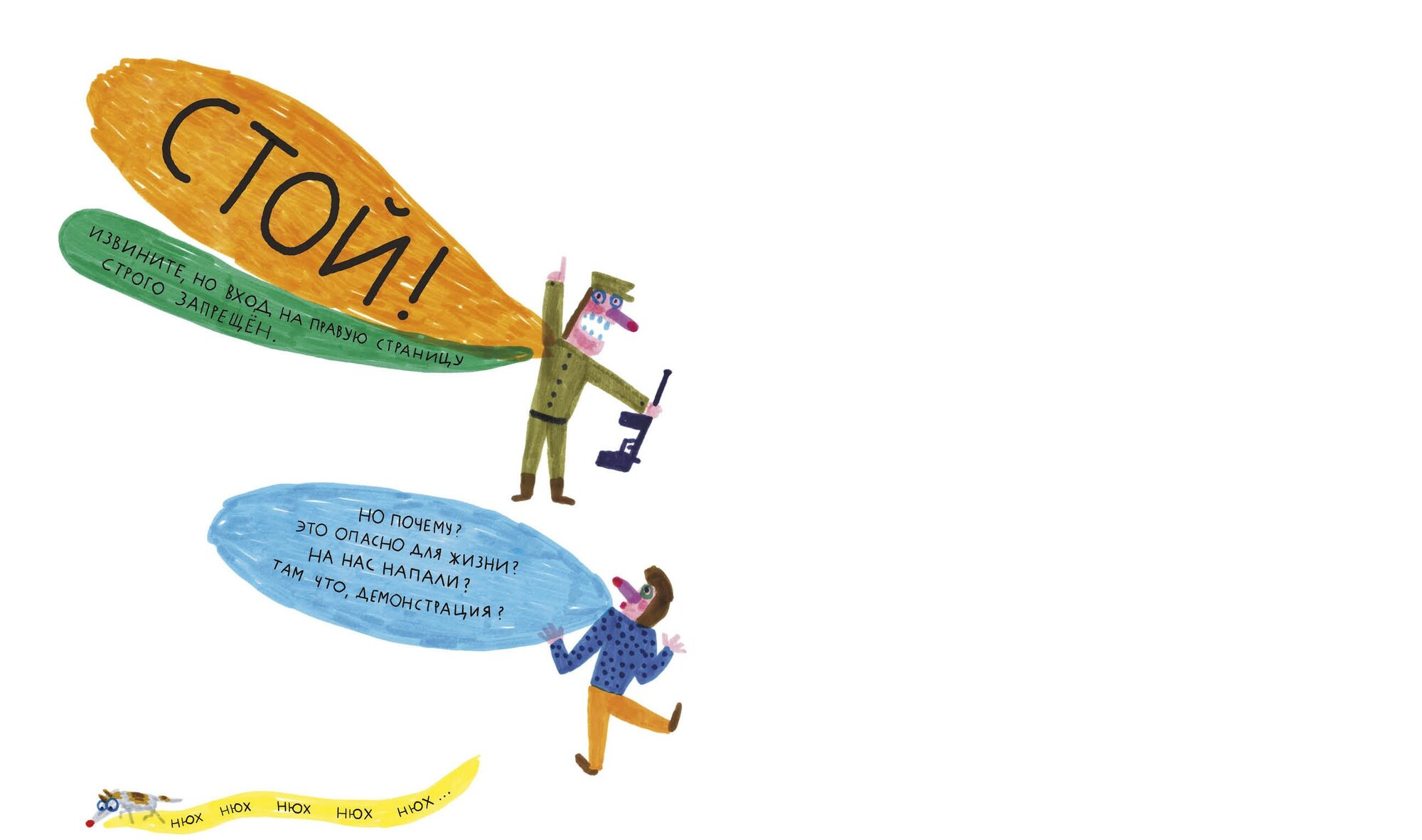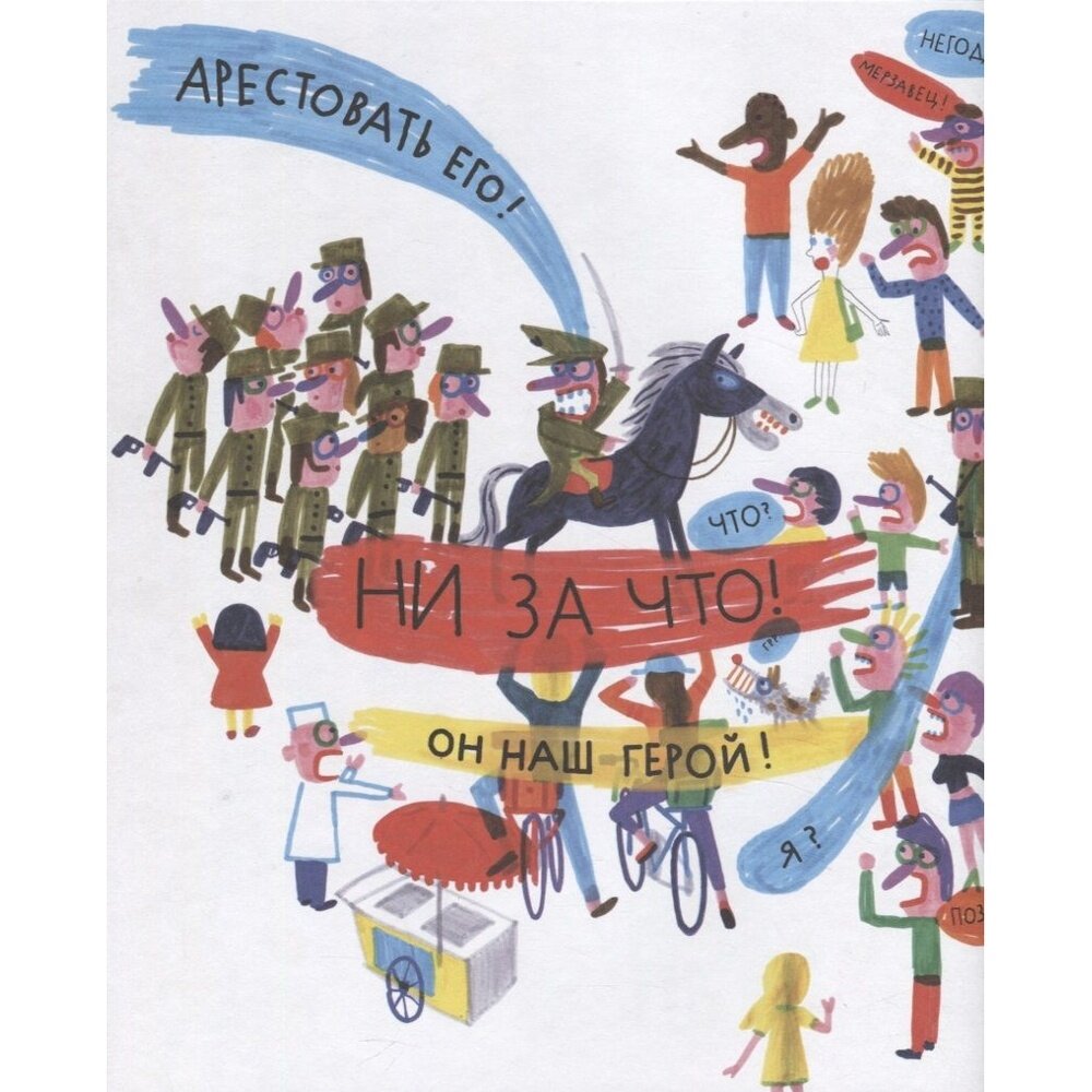 Вот это книжка! Столько в ней народу, а все застряли на одной половине. Потому что нельзя пройти, приказ! Вроде и простая идея, но какой силой обладает белый лист в книге — я искренне сопереживала, пройдут в итоге все дальше или нет, и что с солдатиком станет? Ребёнок 4 лет сказал, что он сейчас всё нарисует, как там было, в подробностях. Иллюстрации очень вдохновляют на собственные рисунки
