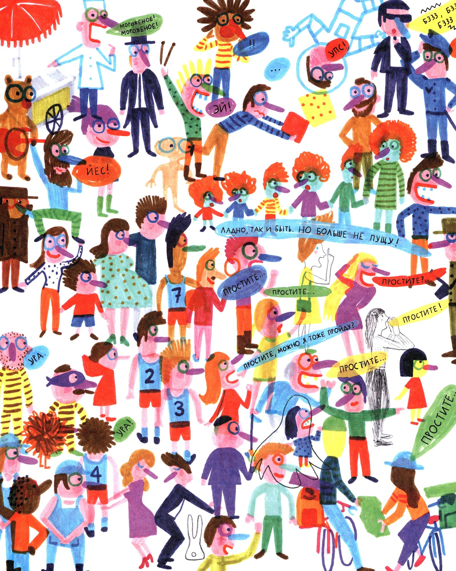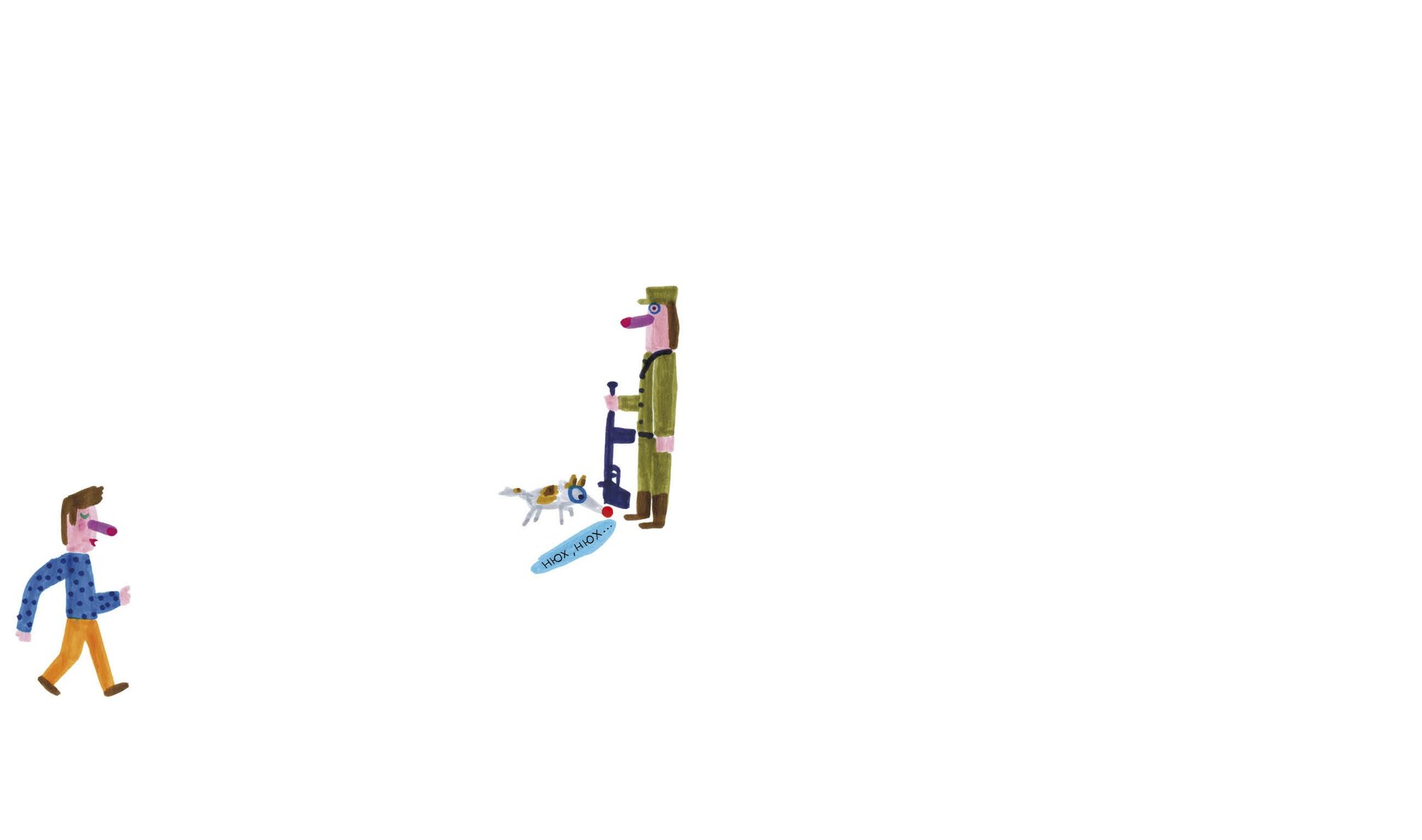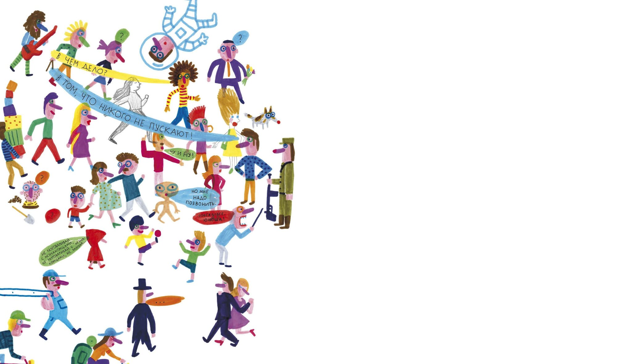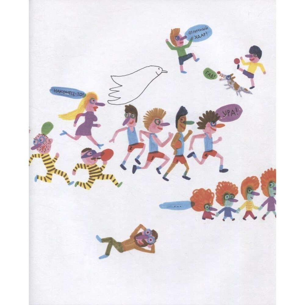 Вот это книжка! Столько в ней народу, а все застряли на одной половине. Потому что нельзя пройти, приказ! Вроде и простая идея, но какой силой обладает белый лист в книге — я искренне сопереживала, пройдут в итоге все дальше или нет, и что с солдатиком станет? Ребёнок 4 лет сказал, что он сейчас всё нарисует, как там было, в подробностях. Иллюстрации очень вдохновляют на собственные рисунки