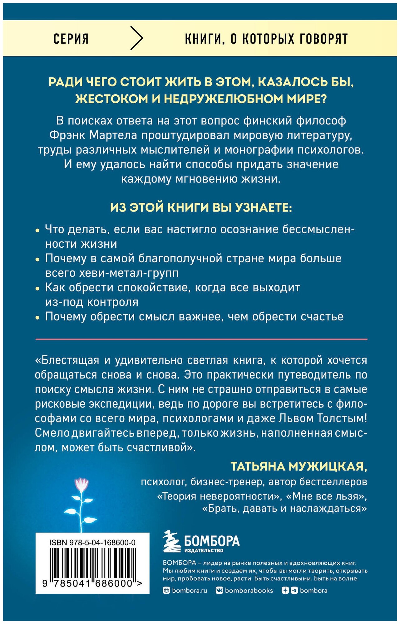 Я не обещаю вам, что эта книга «подарит» вам смысл жизни, но она точно откроет завесу тайны и после прочтения вы больше никогда не спросите себя «а в чем собственно смысл жизни?». Книга написана очень понятным, простым языком, приводится множество исторических справок, цитат и учений философов разных эпох и наблюдения с точки зрения науки, политологии и религии и тд. Я однозначно советую ее всем и каждому, потому что все мы в определенный период жизни задаемся вопросом о смысле каждого прожитого дня. Лично я после прочтения многое для себя поняла и уже никогда не пущу свою жизнь в тартарары. Перечитывать ее планирую каждые пол года, чтобы освежать в памяти знания/мысли и не забывать, что времени не так много на все то, что я хочу успеть, но каждая минута моей жизни невероятно ценна для меня и близких мне людей. Однозначно 6 из 5 -