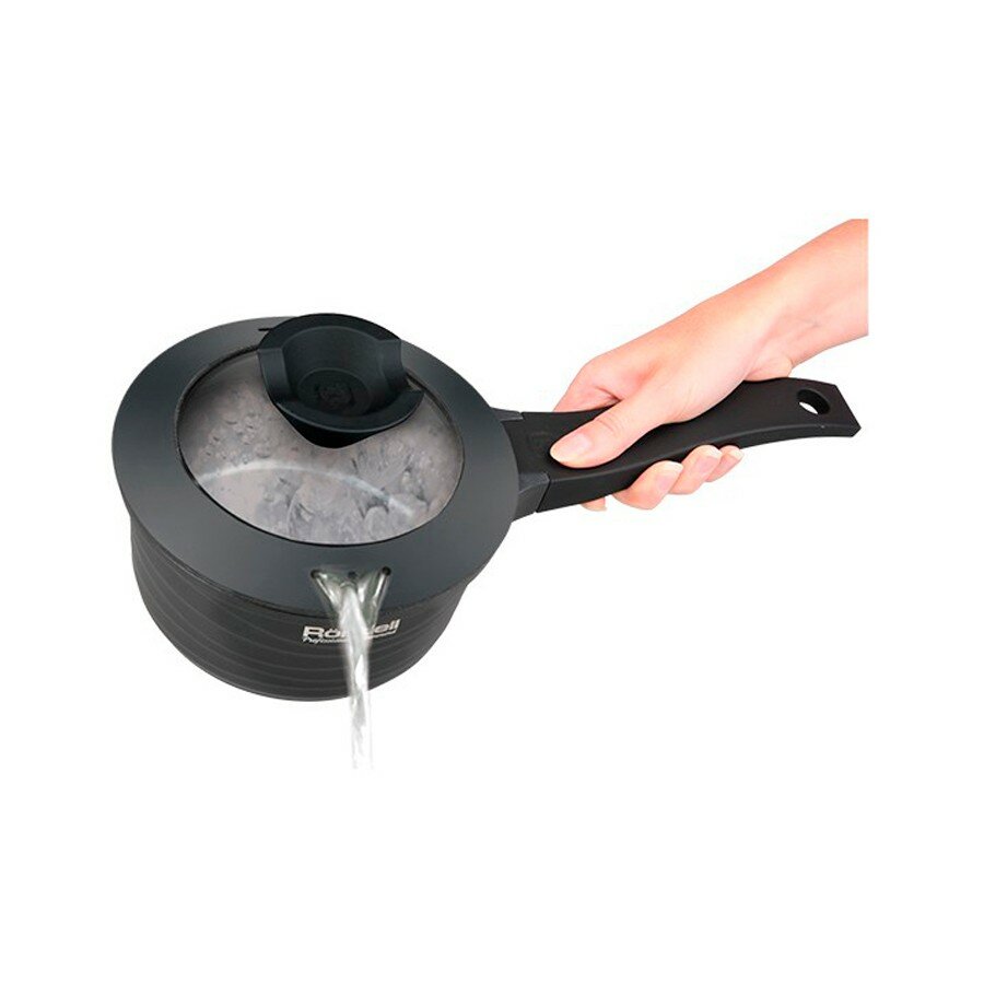 Ковш Rondell "Walzer" изготовлен из литого алюминия с антипригарным покрытием TriTitan на основе титана. Покрытие имеет уникальные свойства: долговечность и устойчивость к воздействию металлических аксессуаров. Также TriTitan позволяет готовить с использованием минимального количества масел, жиров и сохраняет естественный вкус продуктов. Покрытие абсолютно безвредно, не содержит PFOA. Крышка выполнена из жаропрочного стекла в комбинации с бакелитом и силиконом. Оригинальный дизайн крышки позволяет сливать жидкость без дополнительных усилий, просто повернув ее перфорированной стороной нужного диаметра к стенке ковша. Силиконовый обод на крышке позволяет бесшумно накрывать посуду и предотвращает сколы. Функциональная ручка на крышке оснащена специальной выемкой для держания ложки. Бакелитовые ручки с покрытием SoftTouch не нагреваются и не скользят. Подходит для использования на всех типах плит (газовых, электрических, галогенных, стеклокерамических), включая индукционные. Не подходит для использования в духовке. Нельзя мыть в посудомоечной машине. В комплекте буклет с рецептами блюд от шеф-повара.