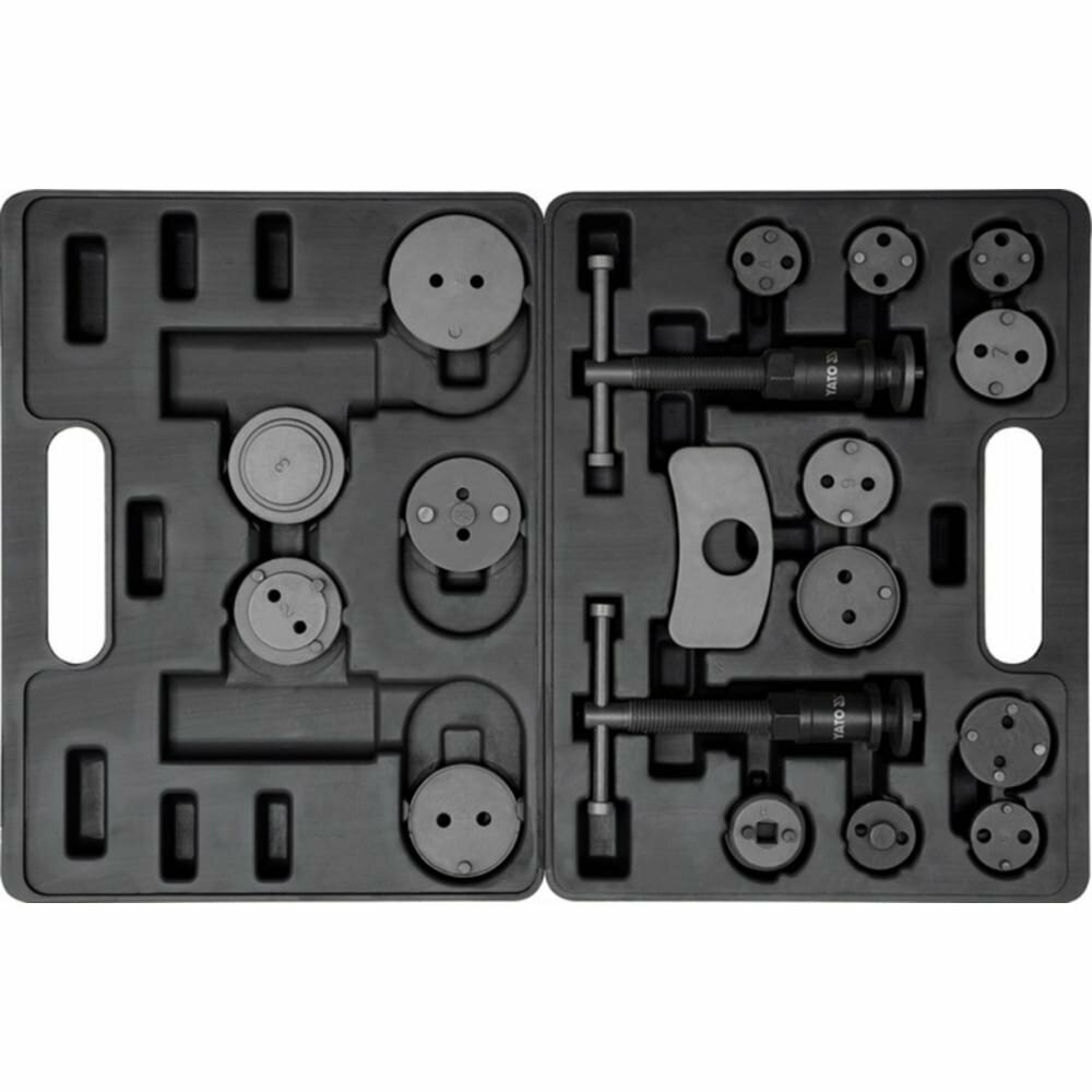 Профессиональный набор, предназначенный для ремонта тормозных суппортов. Устройство состоит из двух винтовертов - по часовой стрелке и для левой руки и набора пластин, позволяющих заменять поршни в широком диапазоне автомобилей.