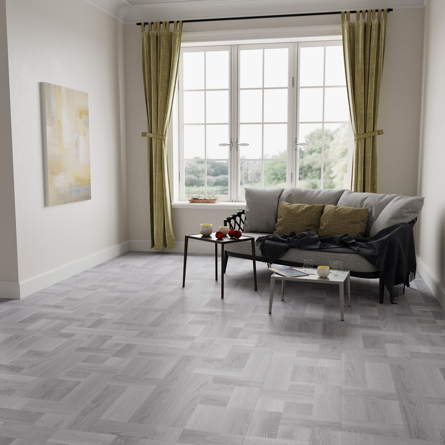 Ламинированный пол с рисунком дерева, разделенного микрофасками в виде художественно уложенного наборного паркета, достоверно воспроизводит паркетные полы.