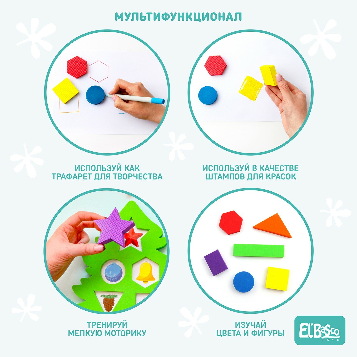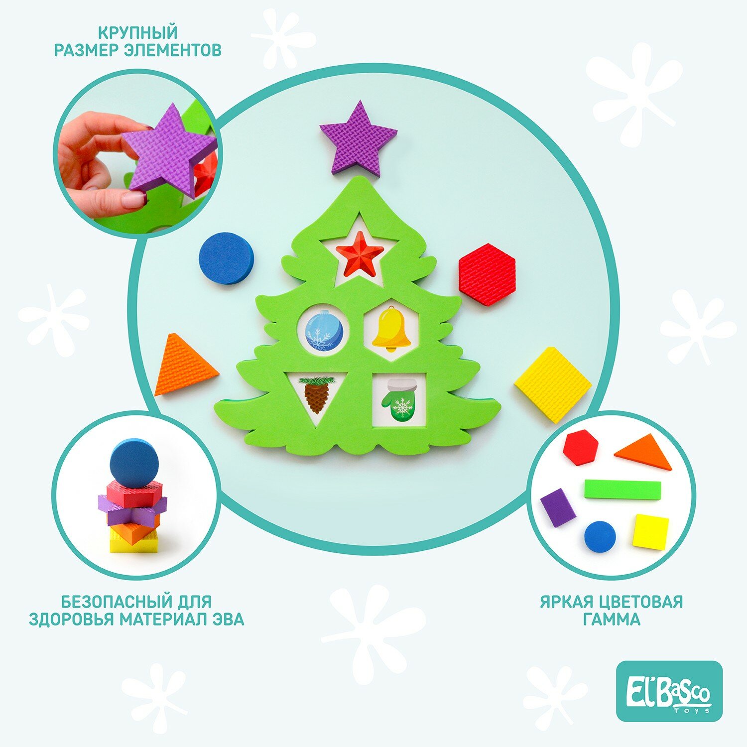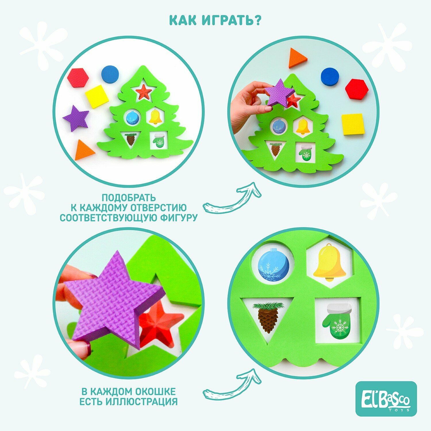 Игрушка состоит из нескольких деталей в форме геометрических фигур, изготовленных из ЭВА, которые необходимо извлекать из углублений сортера и помещать на место, в подходящее для детали "окошечко". За съемными деталями прячутся разнообразные изображения елочных игрушек. Вместе с головоломкой-сортером ребенок научится соотносить геометрические фигуры, подбирать их по цвету, размеру и форме.