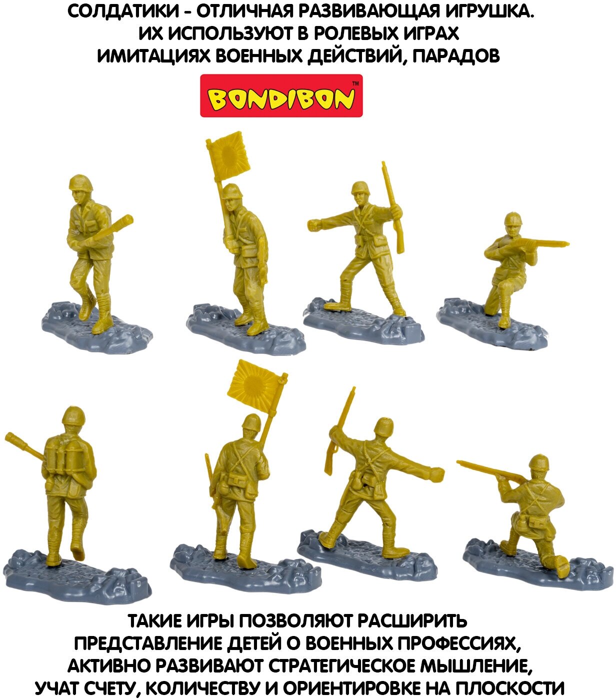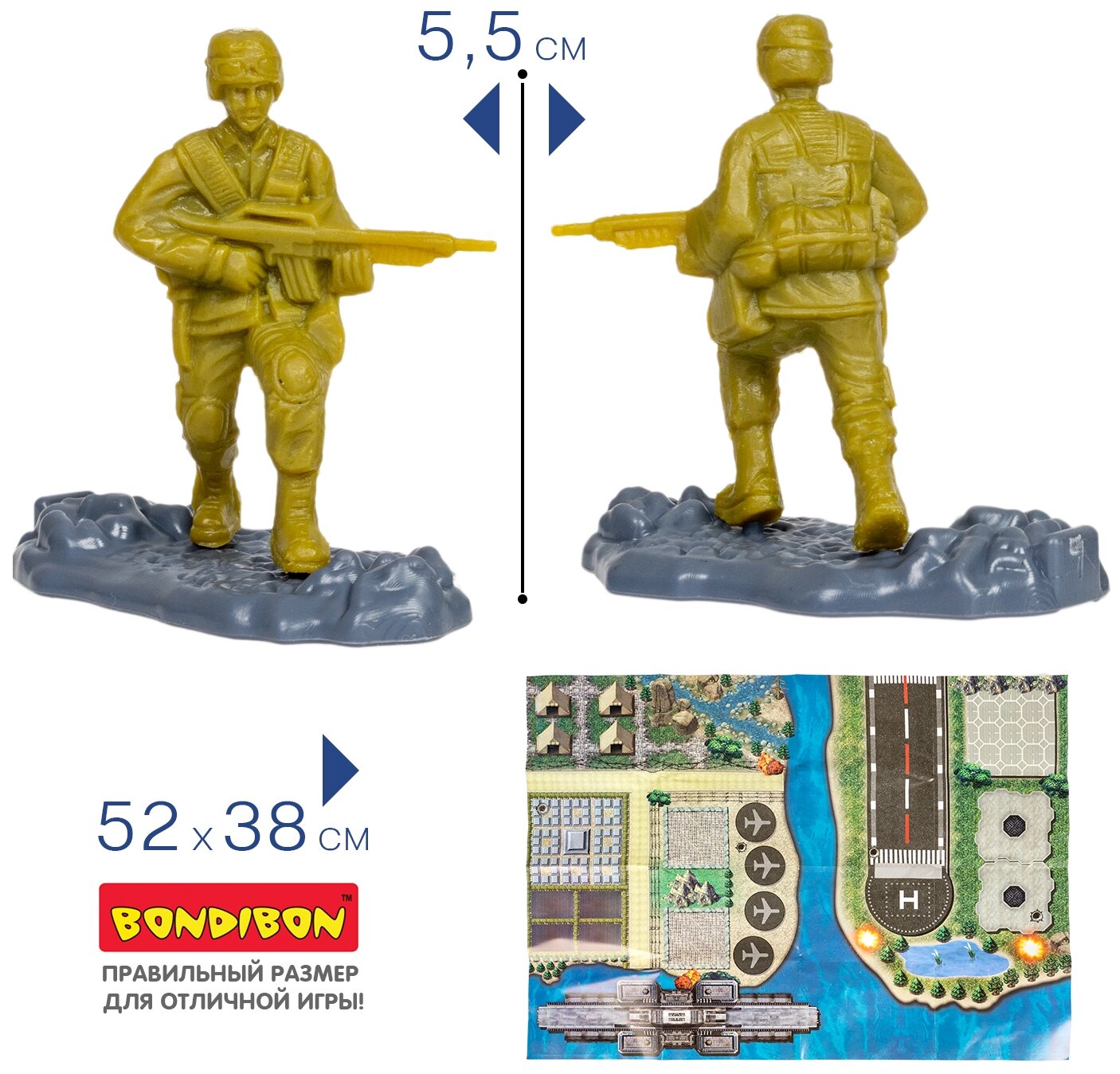 Набор армии Bondibon пригодится мальчику для того, чтобы разыгрывать сюжетно-ролевые игры, развивая воображение и моторику. А еще активно развивается логическое мышление, и ребенок учится мыслить стратегически, как полководец!