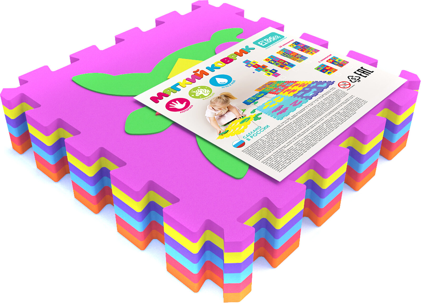 Детский коврик, состоящий из 6 элементов. С мягким ковриком ребенку будет весело и комфортно познавать мир. Коврик приятный на ощупь и не боится воды, состоит из безопасного материала ЭВА. Коврик 5в1 можно использовать в качестве напольного покрытия, собирать в куб, изучать цвета и животных, купаться в ванной, а также тренировать зрительное восприятие, логику и моторику.
