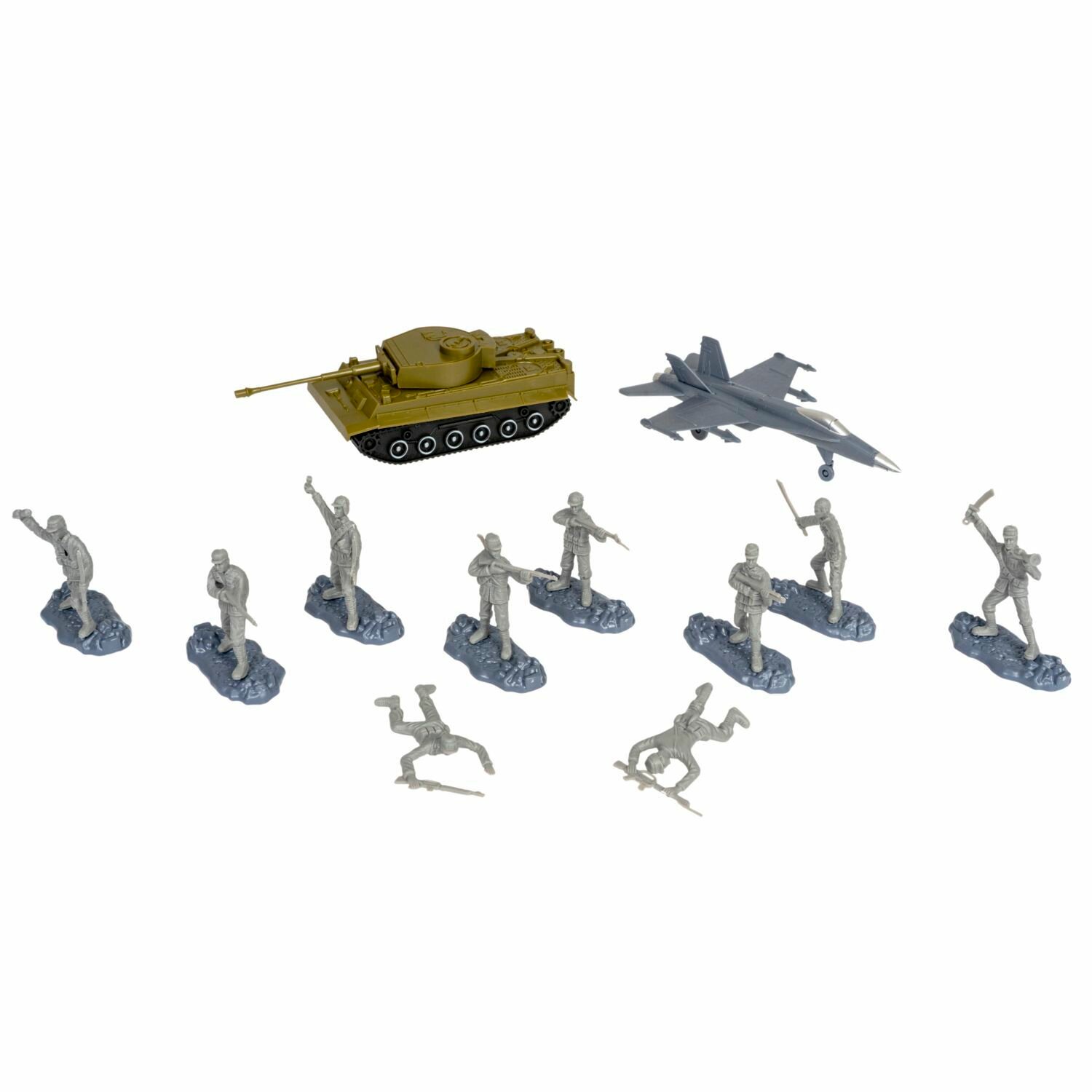 Игровой набор состоит из 10 разных фигурок солдат с оружием, танка, самолета, военной карты и других аксессуаров. Возраст 3+