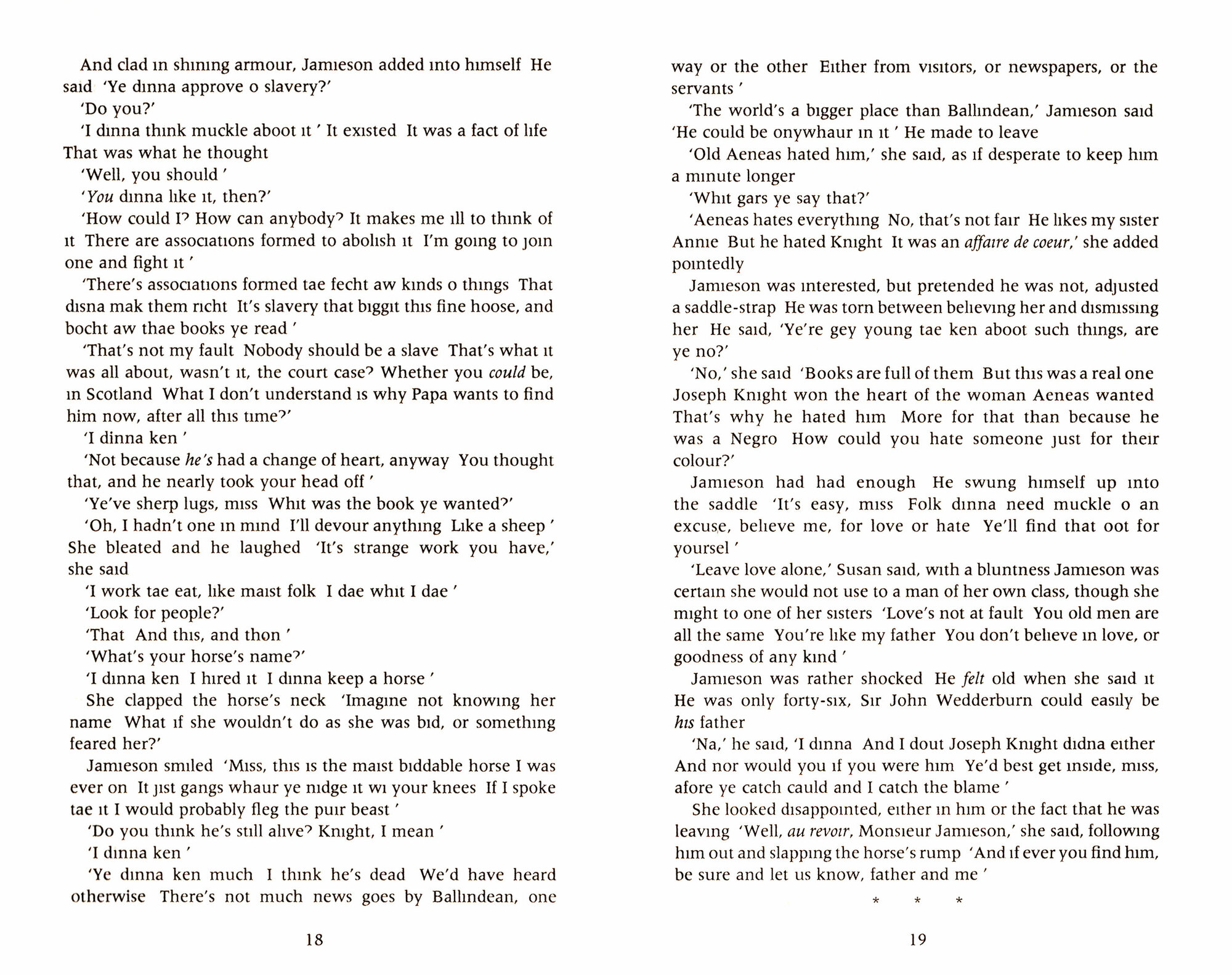 Now, in 1802, Sir John Wedderburn is settling his estate, and has hired a solicitor's agent, Archibald Jamieson, to search for his former slave. The past has haunted Wedderburn ever since Culloden, and ever since he last saw Knight, in court twenty-four years ago, in a case that went to the heart of Scottish society, pitting master against slave, white against black, and rich against poor.