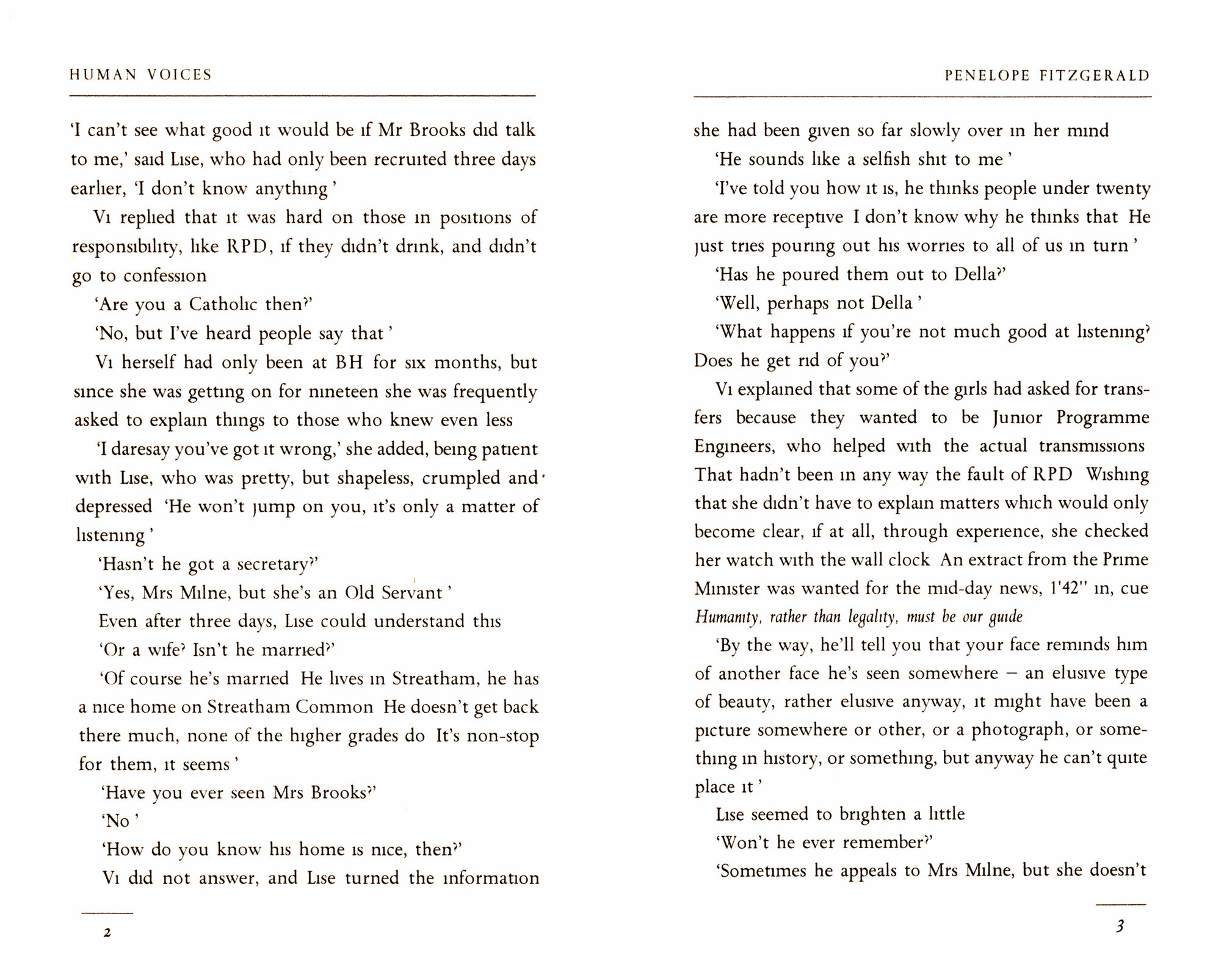 The human voices of Penelope Fitzgerald’s novel are those of the BBC in the first years of the World War II, the time when the Concert Hall was turned into a dormitory for both sexes, the whole building became a target for enemy bombers, and in the BBC – as elsewhere – some had to fail and some had to die, but where the Nine O’Clock News was always delivered, in impeccable accents, to the waiting nation.