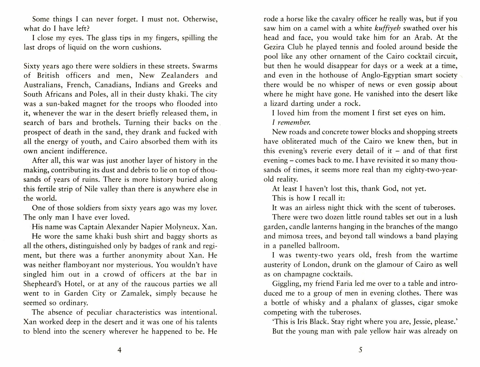 An unlikely bond develops as Ruby helps Iris document her fading memories of the glittering, cosmopolitan Cairo of World War Two, and of her one true love – the enigmatic Captain Xan Molyneux – whom she lost to the ravages of war.