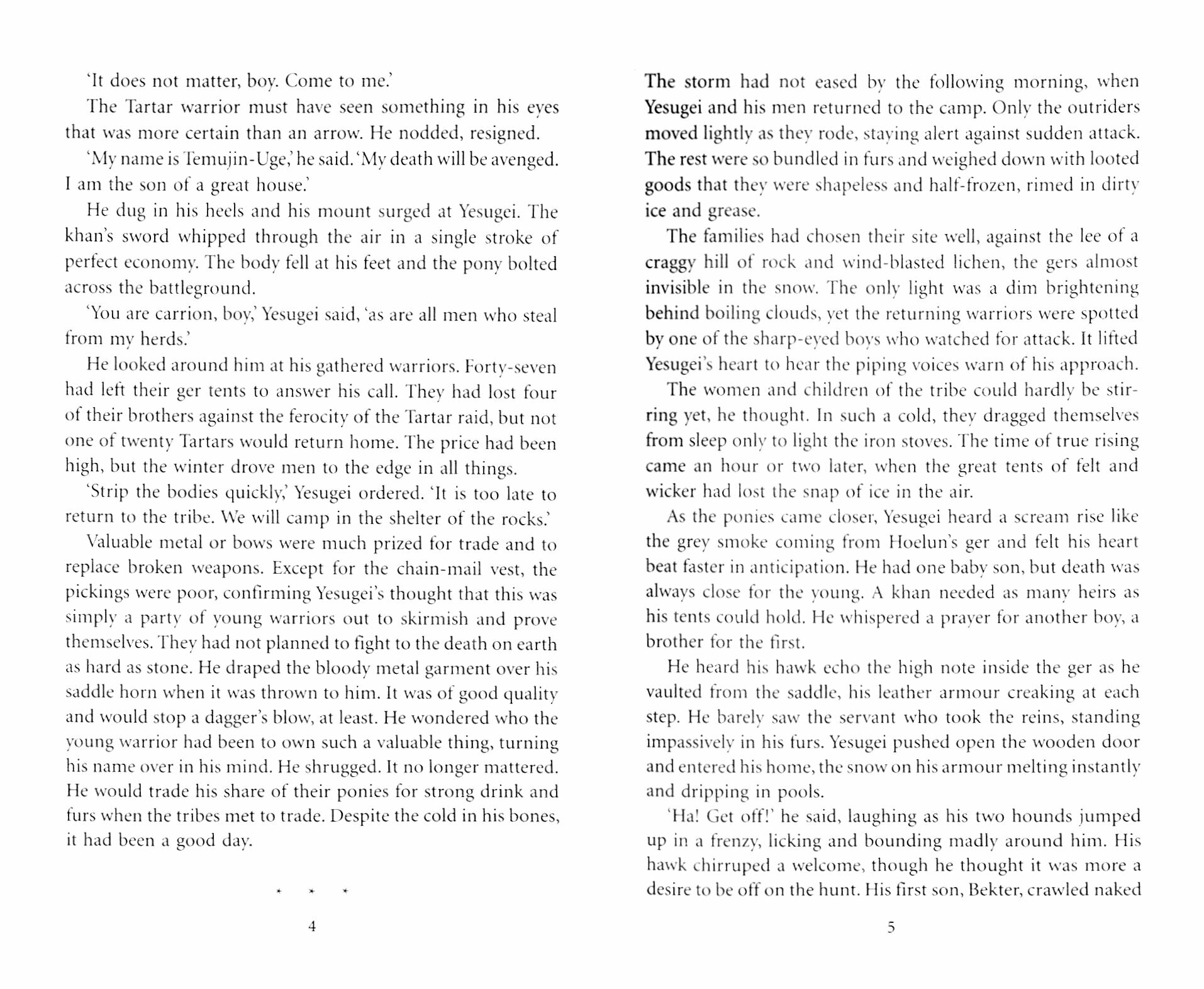 Temujin, the second son of the khan of the Wolves tribe, was only eleven when his father died in an ambush.His family were thrown out of the tribe and left alone, without food or shelter, to starve to death on the harsh Mongolian plains.