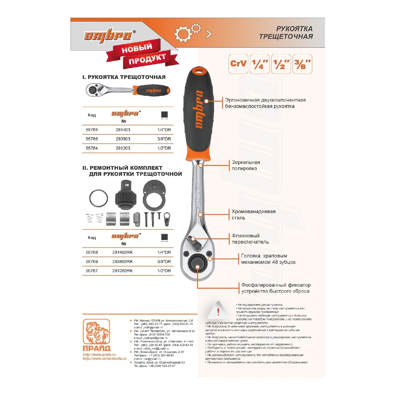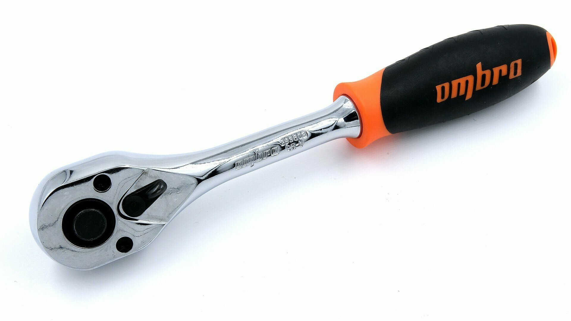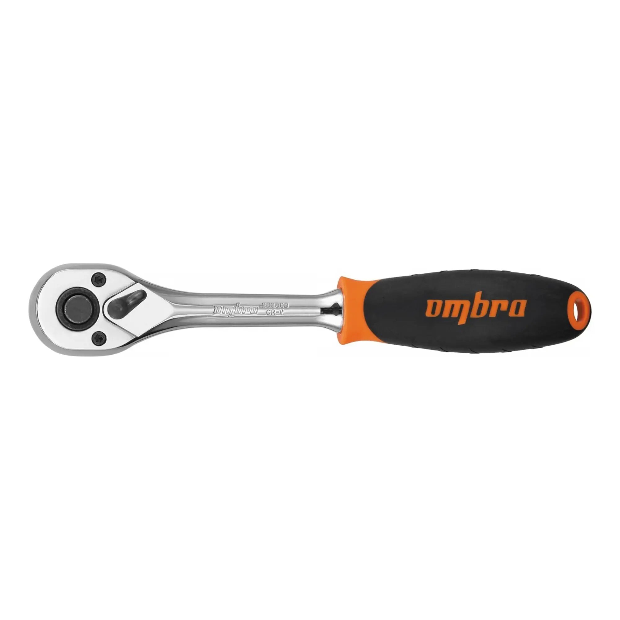 Трещоточные рукоятки OMBRA изготовлены из легированной хромованадиевой стали по технологии, позволяющей при использовании прилагать нагрузки, превышающие предельно допустимые для подобного инструмента на 30-50%. Зеркальное хромоникелевое покрытие придает инструменту безупречный вид и облегчает удаление загрязнений после работы.Трещоточные рукояти OMBRA с храповым колесом, обеспечивающим увеличенное пятно контакта храпового механизма гарантируют большой запас прочности при высоком моменте, который можно развить благодаря эргономичной, двухкомпонентной рукоятке. Устройство быстрого сброса обеспечивает легкую смену и надежно фиксирует оснастку на приводе.