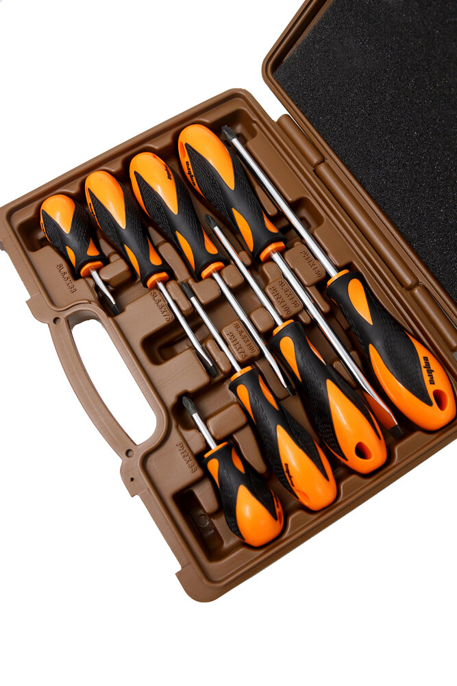 Набор отверток Ombra ROUND GRIP 975008 предназначен для монтажных, крепежных или ремонтных работ с резьбовыми соединениями, имеющими рабочие профили SL и PH. Оптимальная комплектация, проверенное временем качество инструмента удовлетворит потребности не только любителя, но и профессионала. Стрежни отверток изготовлены из хромо-ванадиевой стали. Наконечники покрыты специальным износостойким и антикоррозийным слоем, поэтому отвертки прослужат долго.
