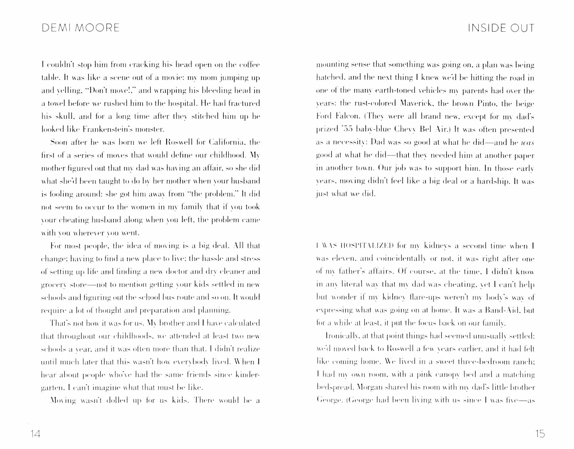 As much as her story is about adversity, it is also about tremendous resilience. In this deeply candid and reflective memoir, Demi pulls back the curtain and opens up about her career and personal life - laying bare her tumultuous relationship with her mother, her marriages, her struggles balancing stardom with raising a family, and her journey toward open heartedness. Inside Out is a story of survival, success, and surrender - a wrenchingly honest portrayal of one woman's at once ordinary and iconic life.