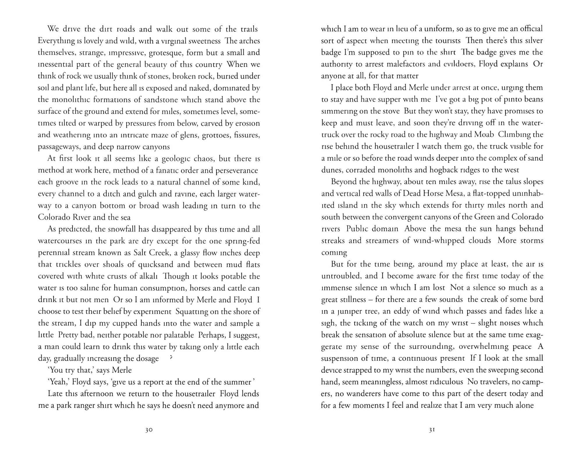 Living out of a trailer, Abbey captures in rapt, poetic prose the landscape of the desert; a world of terracotta earth, empty skies, arching rock formations, cliffrose, juniper, pinyon pine and sand sage. His summers become spirit quests, taking him in search of wild horses and Ancient Puebloan petroglyphs, up mountains and across tribal lands, and down the Glen Canyon by river. He experiences both sides of his new home; its incredible beauty and its promise of liberation, but also its isolating, cruel side, at one point discovering a dead tourist at an isolated area of the Grand Canyon.