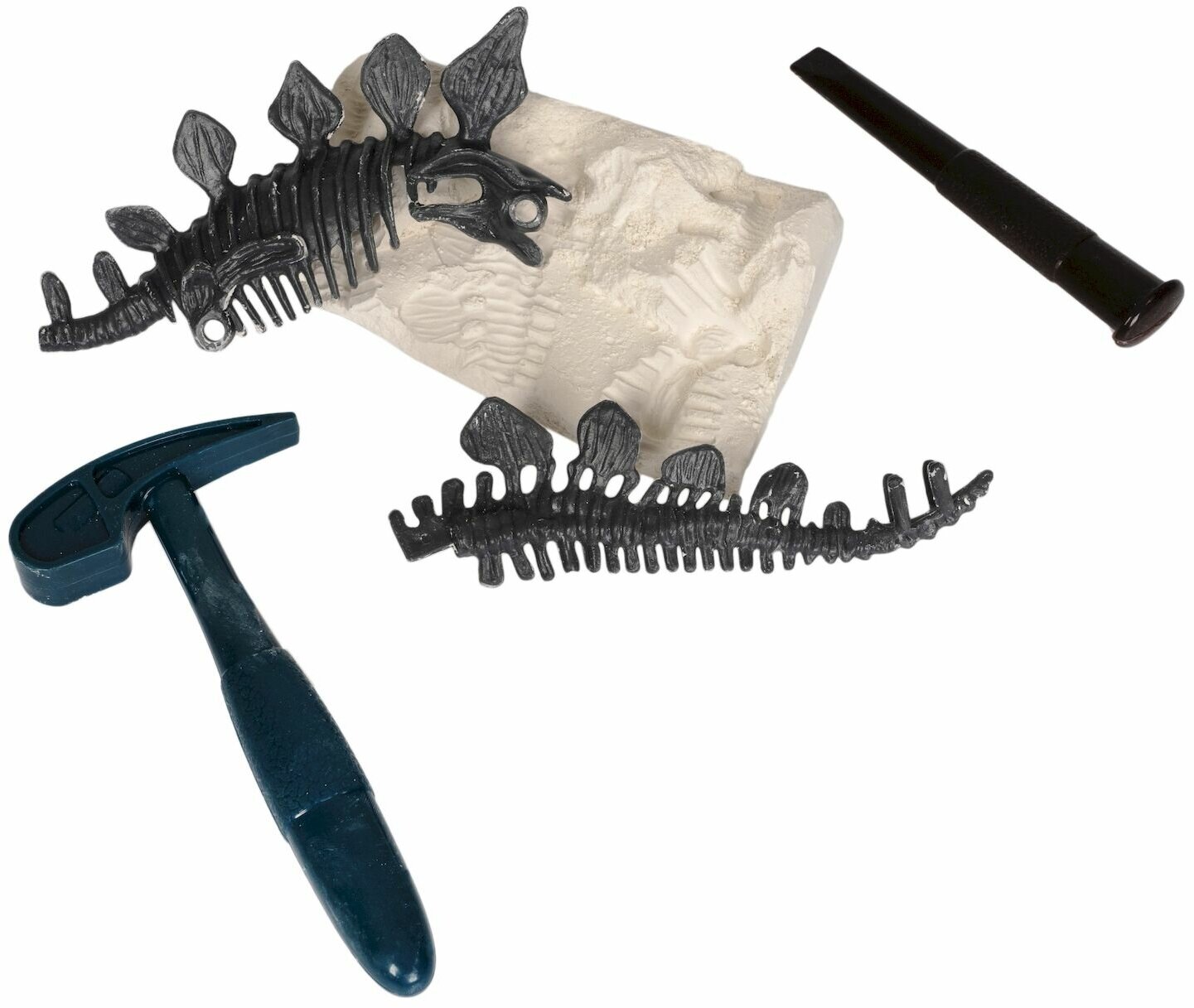 | Комплектация | блок для проведения раскопок, молоток, зубило, пузырек с пульверизатором, скелет стегозавра внутри гипсового блока, иллюстрированная инструкция |