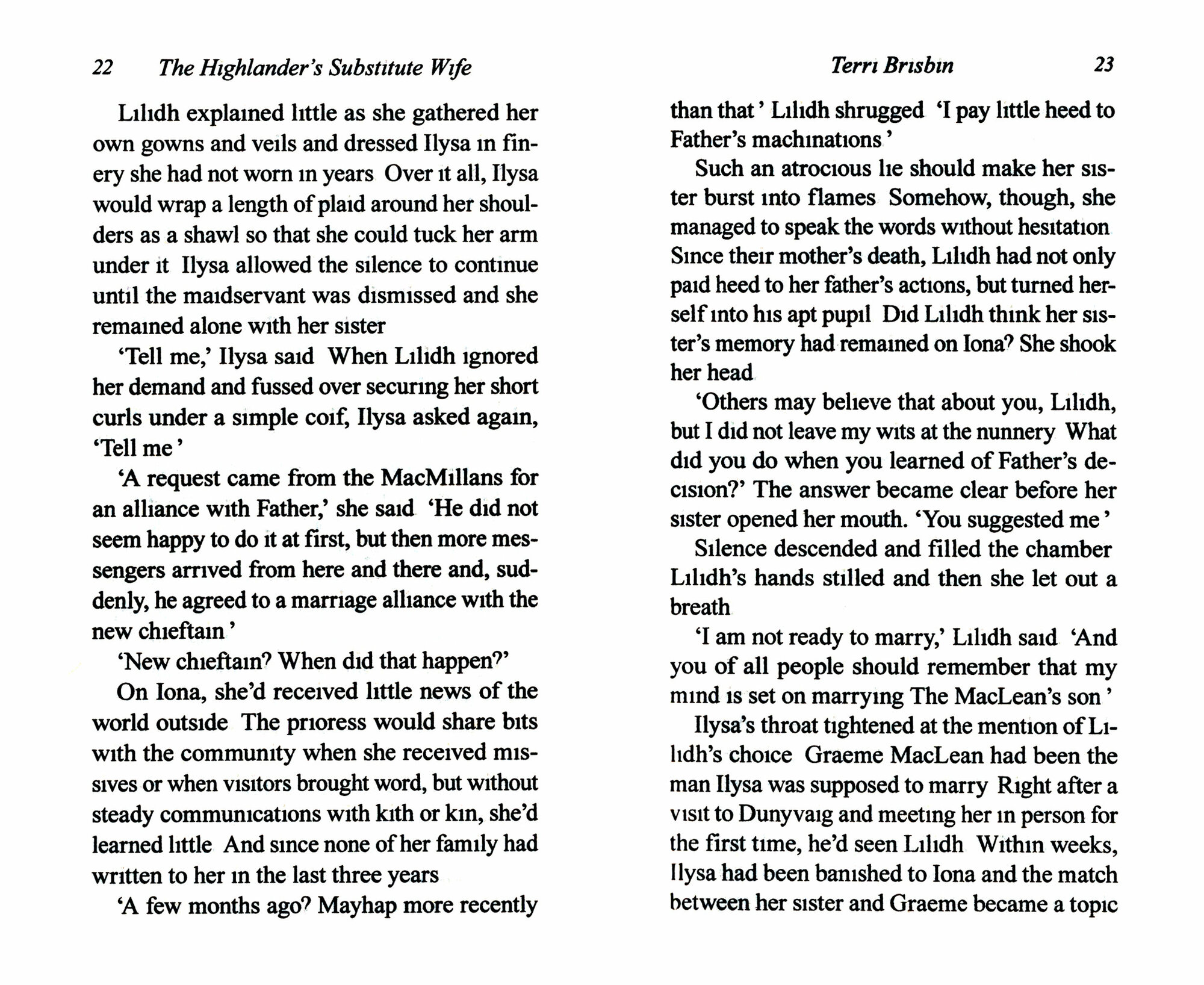 Ross MacMillan lifts his bride’s veil…and discovers it’s not the woman he’d agreed to marry, but her beautiful younger sister, Ilysa MacDonnell! The new MacMillan chieftain must accept Ilysa as his wife, for retaining his clan’s lands depends on her father’s support. But why is she there – are her aims to help him or her father? Drawing out Ilysa’s secrets will kindle an alliance more powerful — and passionate! — than Ross ever imagined….