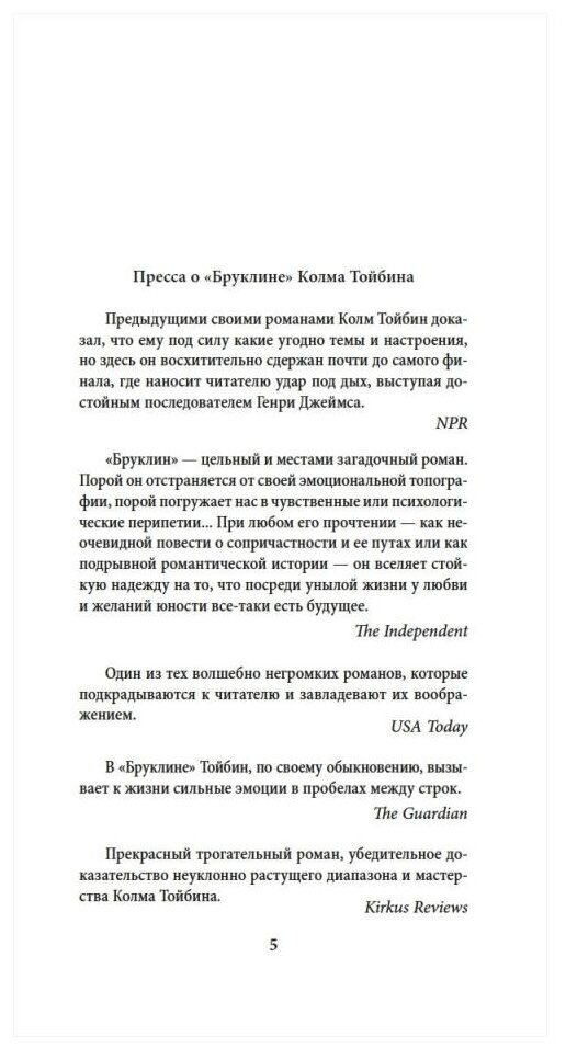 Колм Тойбин — одна из крупнейших фигур современной ирландской литературы, тонкий и многообразный писатель, чьи книги неоднократно попадали в шорт-лист «Букера» и удостаивались значимых литературных наград. За «Бруклин», тихую историю молодой женщины и ее поисков себя, где чувства бурлят в глубине и всплывают на поверхности лишь рябью, намеком, недоговоренностью, автор получил Премию Коста, а в 2015 году Джон Краули экранизировал этот роман по сценарию, написанному совместно Тойбином и Ником Хорнби. Героиня «Бруклина» Эйлиш в поисках работы и перемены участи отправляется из родного Эннискорти, где все так знакомо и уютно, в чужой непривычный Нью-Йорк. Там она мучается от ностальгии, ищет свое место в новой стране, встречает любовь, принимает непростые решения и уже осваивается, когда печальные семейные вести призывают ее назад в Ирландию. Все иммигрантские истории на первый взгляд похожи, но никогда друг друга не повторяют. «Бруклин» — минорная одиссея, где нет особых страстей, но все пропитано чувствами, пронзительными и неотвязными, история странствия одной молодой женщины туда и обратно, из Эннискорти в Бруклин и снова в Эннискорти, — в поисках себя, своей самостоятельности, своего места, но в конечном счете своего дома, откуда невозможно убежать и куда невозможно вернуться.
