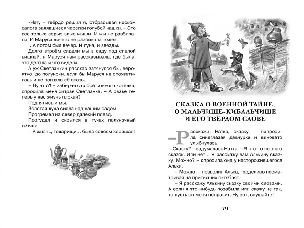 История, знакомая с детства. Добрые рассказы Аркадия Гайдара так и веют теплотой, и чем-то родным, давно знакомым, добрым и милым. Про Чука и Гека тоже есть рассказ тут, а помимо прочего \"Четвертый блиндаж\", \"Голубая чашка\", \"Сказка о Военной тайне ...\". Рассказы сопровождают чёрно-белые иллюстрации. Обложка твердая, глянцевая, из экранизации последней. Печать отличного качества, листы в книге белые.