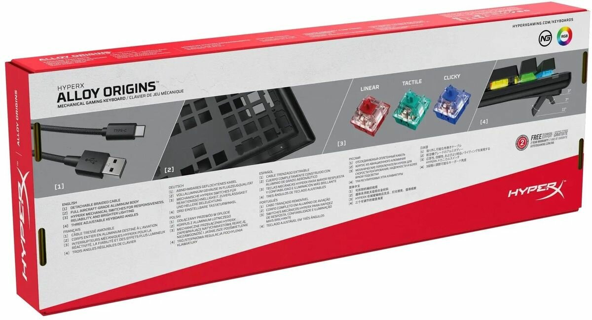 HyperX Alloy Origins™ — это компактная и прочная клавиатура с персонализированными механическими переключателями HyperX, разработанная в целях обеспечения для геймеров наилучшего сочетания стиля, производительности и надежности. Эти клавишные переключатели оснащены открытыми светодиодами, обеспечивающими потрясающую подсветку, с усилием срабатывания и расстоянием хода, элегантно сбалансированными для обеспечения скорости реагирования и точности. Клавиатура Alloy Origins сконструирована с цельным алюминиевым корпусом, поэтому она остается прочной и устойчивой при стремительном потоке нажатий клавиш, а также оснащена подставочным основанием, позволяющим выбрать один из трех различных уровней наклона. Её изящная и компактная конструкция освобождает пространство для движений мыши, а также она оснащена съемным USB-кабелем типа C для обеспечения максимальной портативности. Настраивайте персонализированные параметры подсветки, создавайте макросы и регулируйте игровой режим с помощью программного обеспечения HyperX NGENUITY. Эта мощная, но простая в использовании программа позволит вам настраивать подсветку отдельных клавиш, выстраивать потрясающие световые эффекты и добавлять множество других персонализированных штрихов к вашим продуктам, совместимым с NGENUITY.