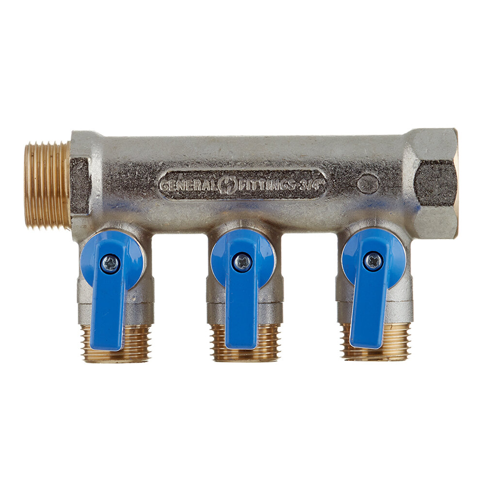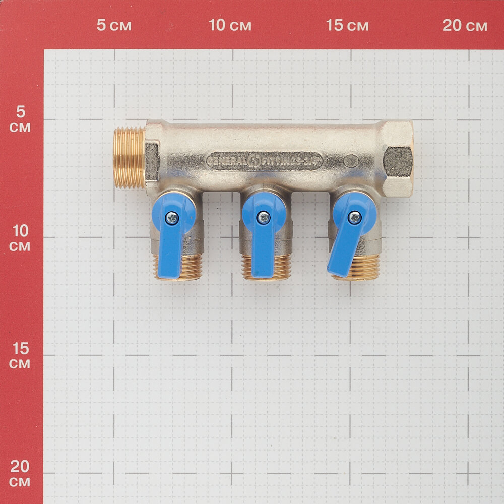 коллектор 3 выхода STOUT 3/4" х 1/2" НР с отсекающими кранами синие ручки (SMB 6211 341203)