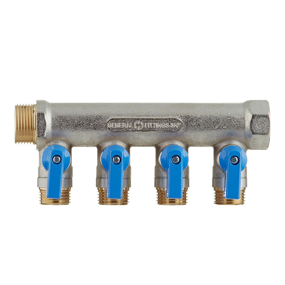 коллектор 4 выхода STOUT 3/4" х 1/2" НР с отсекающими кранами синие ручки (SMB 6211 341204)