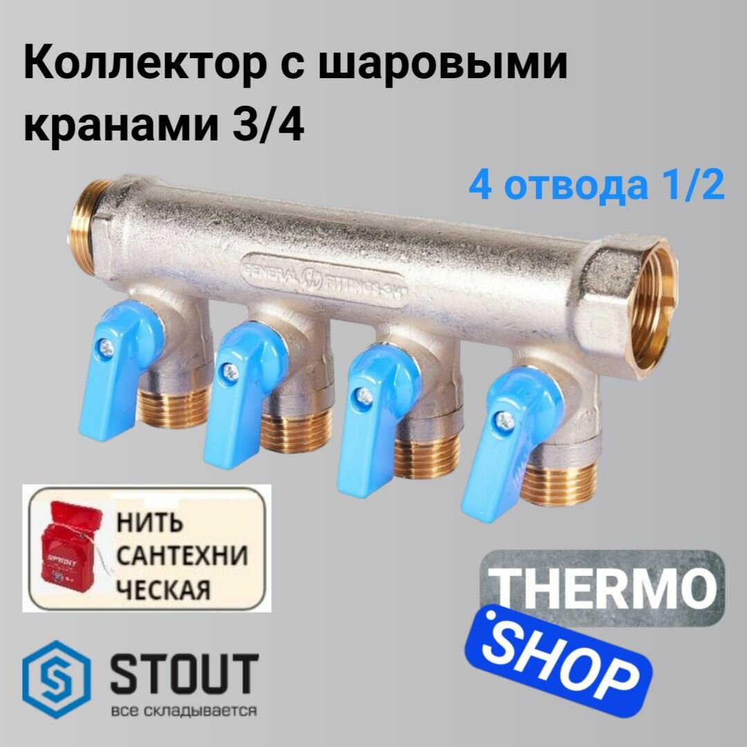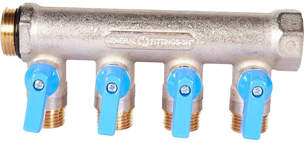 Сервис сравнения цен СкидкаГИД предлагает сравнить цены на товар «коллектор 4 выхода STOUT 3/4" х 1/2" НР с отсекающими кранами синие ручки (SMB 6211 341204)»