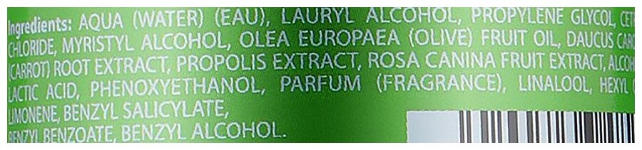 | Состав | LAURYL ALCOHOL, PROPYLENE GLYCOL, CETRIMONIUM CHLORIDE, MYRISTYL ALCOHOL, OLEA EUROPAEA FRUIT OIL, DAUCUS CAROTA SATIVA ROOT EXTRACT, PROPOLIS EXTRACT, ROSA CANINA FRUIT EXTRACT, ALCOHOL DENAT., LACTIC ACID, PHENOXYETHANOL, PARFUM, LINALOOL, HEXYL CINNAMAL, LIMONENE, BENZYL SALICYLATE, BENZYL BENZOATE, BENZYL ALCOHOL, AQUA |