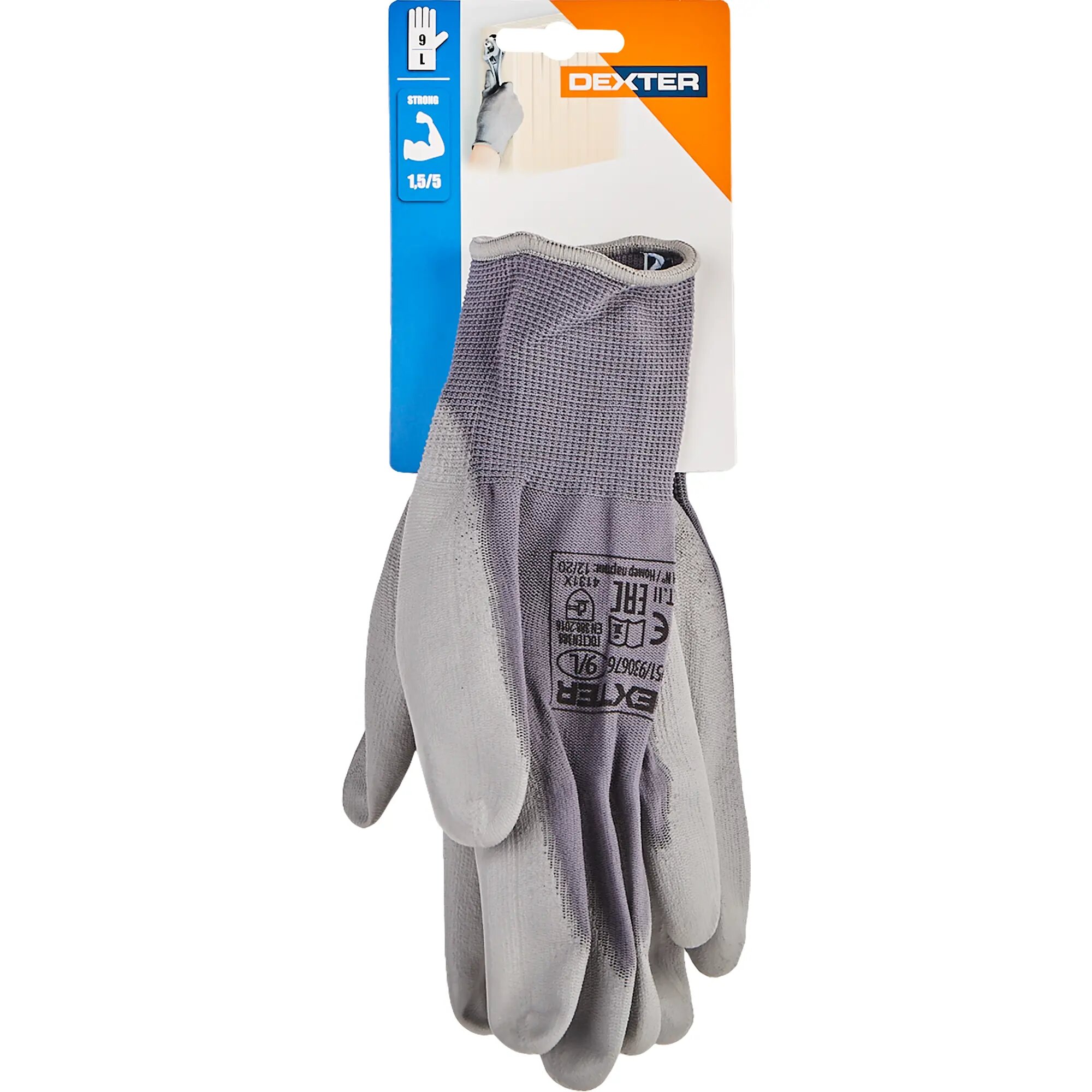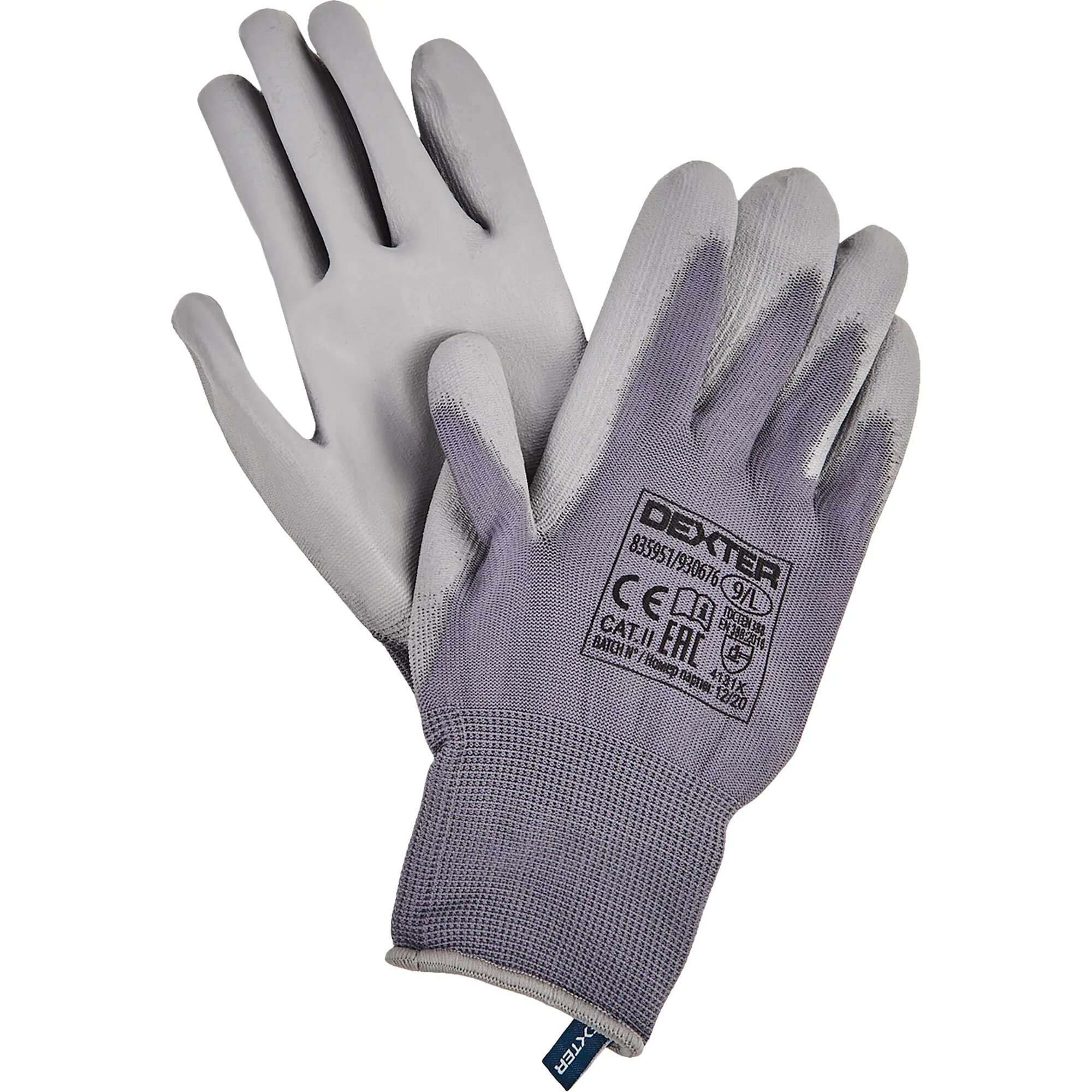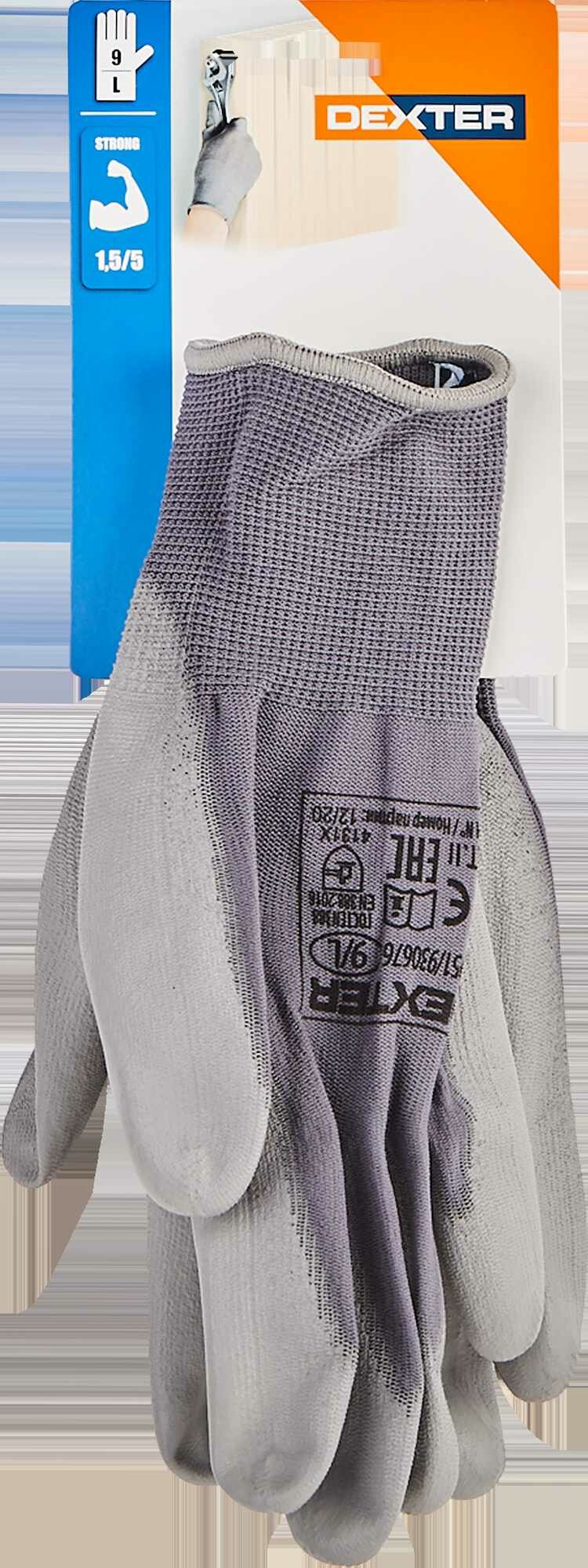 **Перчатки нейлоновые с полиуретановым покрытием Р.9 Dexter** предназначены для защиты рук от грязи и микроповреждений во время ремонтных и строительных работ. Регулировочная резинка позволяет лучше зафиксировать аксессуар на запястье. Благодаря полиуретановому покрытию можно мыть под проточной водой. Выполнены в сером цвете.