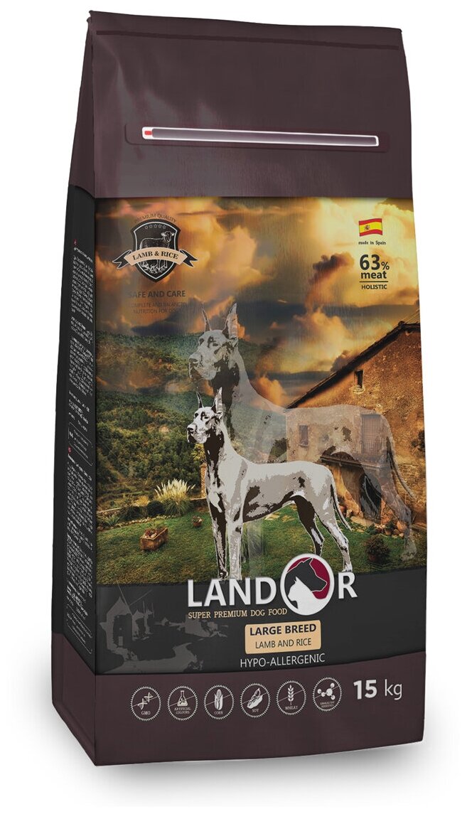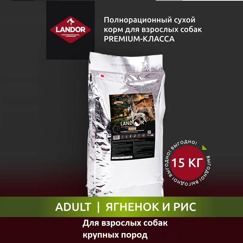 LANDOR ADULT LARGE BREED DOG Полнорационный сухой корм для взрослых собак крупных пород ягненок с рисом 15кг. Крупные и активные собаки требуют полноценного рациона, обязательно включающего корм с большим содержанием микроэлементов, жиров Омега 6 и Омега 3, качественного белка. Мясо ягненка считается с полным на то основанием идеальным продуктом, способным насытить организм всем необходимым, не причинив ему вреда. В составе риса содержится огромное количество микроэлементов, полезных для укрепления и развития организма.Корм для взрослых собак ADULT LARGE BREED DOG нормализует уровень холестерина, не отягощает желудок, поддерживает в желудочно-кишечном тракте здоровую микрофлору.Состав: дегидрированное мясо ягнёнка, рис, ячмень, бобовые, утиный жир, пивные дрожжи, натуральный ароматизатор, растительные волокна, масло лосося, Бутирекс С4 (многофункциональная добавка), экстракт Юкки, морковь, яблоко, ягоды, глюкозамин, хондроитин, таурин, витамин C, холин хлорид, экстракт розмарина, витамин А, витамин D3, витамин Е, витамин K, витамин В12, тиамин, рибофлавин, кальция пантотенат, ниацин, пиридоксин, фолиевая кислота, биотин, сульфат железа, хелатного цинка, сульфат меди, марганца оксид, калия йодид, селенит натрия.Размер гранул идеально подходит для собак крупных пород.Тип мяса, используемый в составе корма, подходит собакам крупных пород.Ингредиенты категории HOLISTIC.Только НАТУРАЛЬНЫЕ антиоксиданты.Сбалансированное содержание Omega 6 и Omega 3 жирных кислот. Нормализация работы сердечно-сосудистой системы.Улучшение пищеварения и микрофлоры кишечника.Нормализация обмена веществ и поддержание оптимального веса.Обеспечение идеального состояния кожи и шерсти.Способствует укреплению суставов и связок.Оптимальный баланс Кальция и Фосфора.Профилактика раковых заболеваний желудочно-кишечного тракта.1-ый и основной ингредиент – ДЕГИДРИРОВАННОЕ МЯСО ЯГНЕНКА.63% мясных ингредиентов.МОНОМЯСНЫЕ СОСТАВЫ.Гипоаллергенный продукт.Не содержит пшеницу, кукурузу, сою, ГМО, искусственные красители, вредные химические добавки, искусственные антиоксиданты и консерванты.Не содержит курицу и куриный жир.Удобная упаковка со слайдером или зип-локом на всех фасовках.