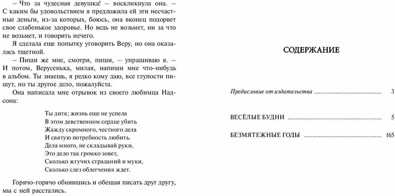 В книгу вошли две повести Веры Новицкой «Весёлые будни» и «Безмятежные годы» - о детстве Муси Старобельской, ученицы закрытой женской гимназии конца XIX века. В начале книги Муся - легкомысленная, шаловливая «приготовишка», готовая целыми днями смеяться и проказничать. В конце - талантливая юная девушка, которая всерьез задумывается о будущем. Рядом с Мусей взрослеют ее подруги, меняются учителя и воспитатели. Повести буквально наполнены живым Петербургом 1890-х годов с его редким солнцем и дождями, повседневным бытом и развлечениями. Они подробно воссоздают неповторимую атмосферу эпохи, на которую пришлись детство и юность будущей писательницы.