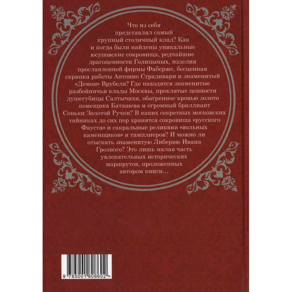 Что из себя представлял самый крупный столичный клад? Как и когда были найдены уникальные Юсуповские сокровища, редчайшие драгоценности Голицыных, изделия прославленной фирмы Фаберже, бесценная скрипка работы Антонио Страдивари и знаменитый "Демон" Врубеля? Где находятся знаменитые разбойничьи клады Москвы, проклятые ценности душегубицы Салтычихи, обагренное кровью золото помещика Баташева и огромный бриллиант Соньки Золотой Ручки? В каких секретных московских тайниках до сих пор хранятся сокровища "русского Фауста" и сакральные реликвии "вольных каменщиков" и тамплиеров? И можно ли отыскать знаменитую Либерию Ивана Грозного? Это лишь малая часть увлекательных исторических маршрутов, проложенных автором, хорошо известным читателю по изданиям "Москва таинственная", "Пантеоны Кремля", "Москва романтическая" и др.