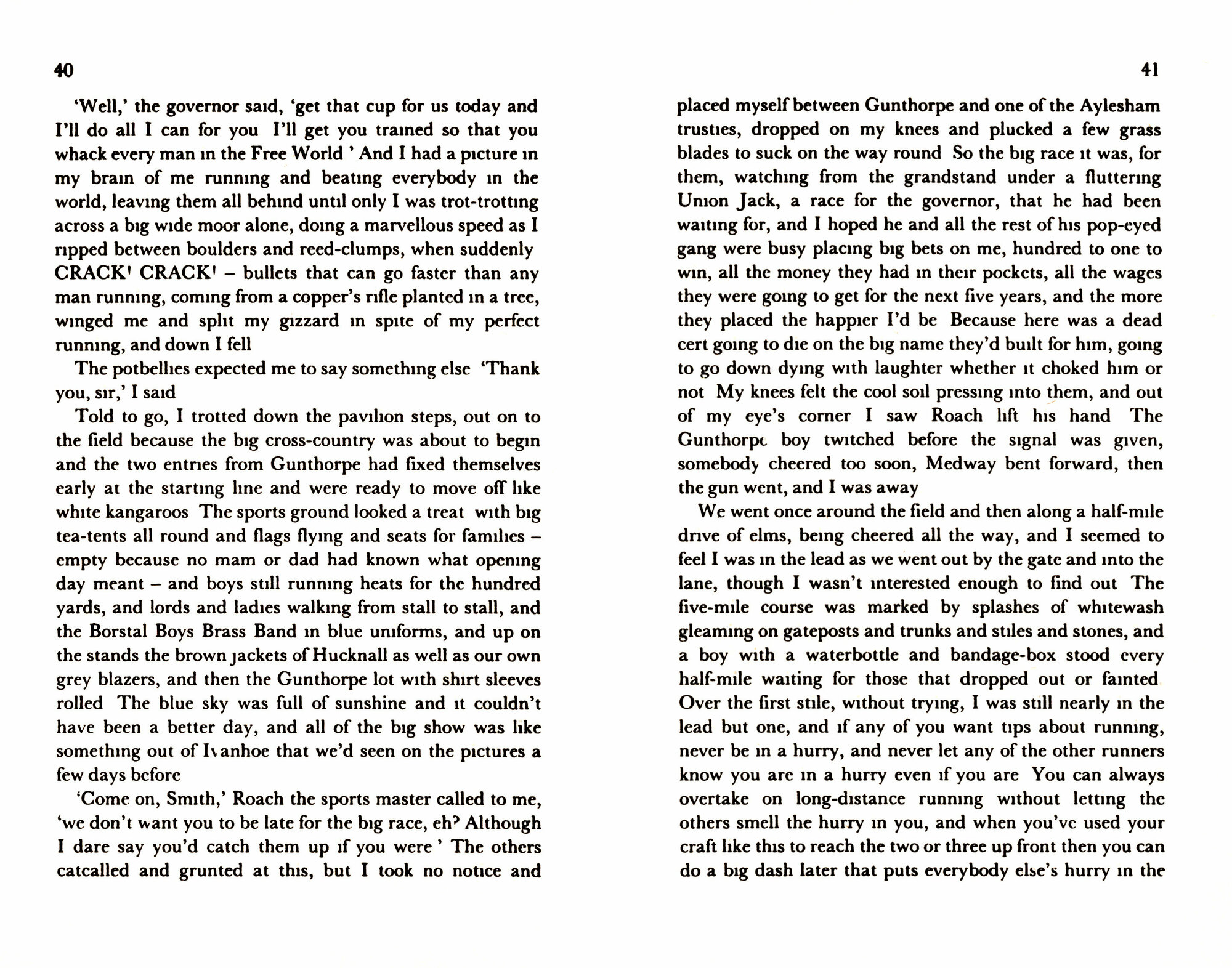 The title story in this classic collection tells of Smith, a defiant young rebel, inhabiting the no-man's land of institutionalised Borstal. As his steady jog-trot rhythm transports him over an unrelenting, frost-bitten earth, he wonders why, for whom and for what he is running.