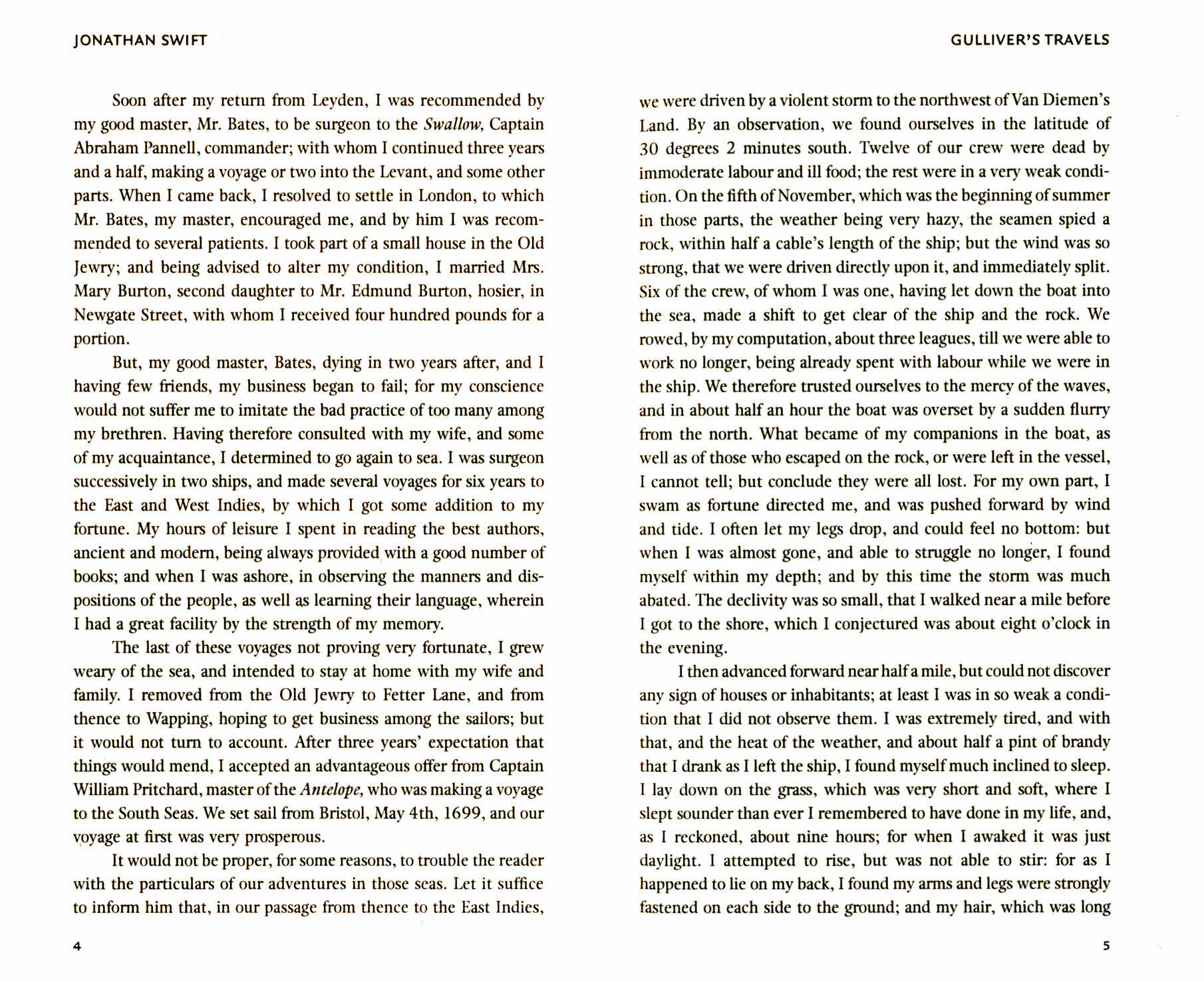 Shipwrecked on the high seas, Lemuel Gulliver finds himself washed up on the strange island of Lilliput, a land inhabited by quarrelsome miniature people. On his travels he continues to meet others who force him to reflect on human behaviour - the giants of Brobdingnag, the Houyhnhnms and the Yahoos. In this scathing satire on the politics and morals of the 18th Century, Swift's condemnation of society and its institutions still resonates today.