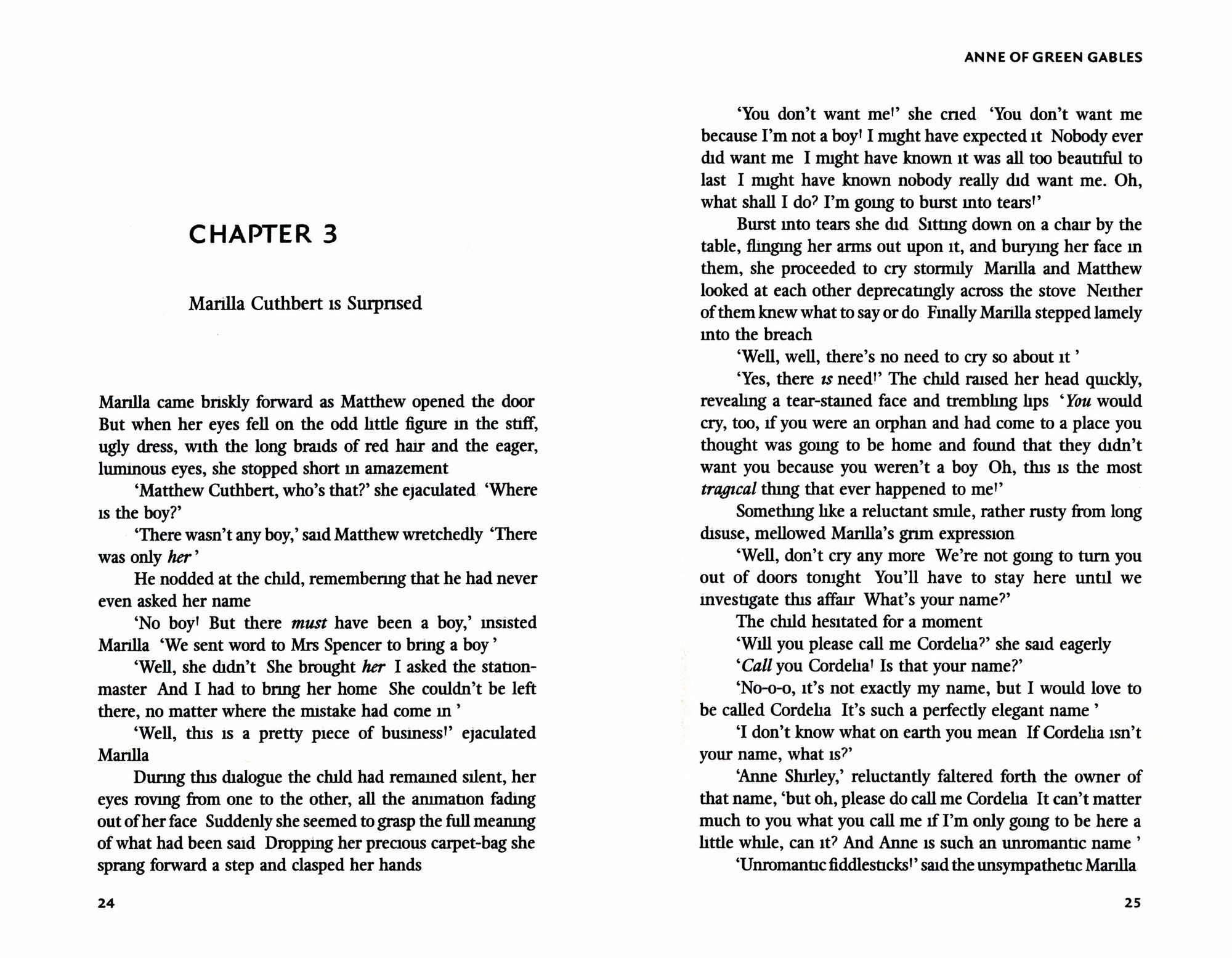 Marilla and Matthew Cuthbert are expecting a young orphan boy to help them with farmwork at Green Gables. But when a skinny, red-haired girl turns up instead, immediately certain she's home, they get much more than they bargained for.