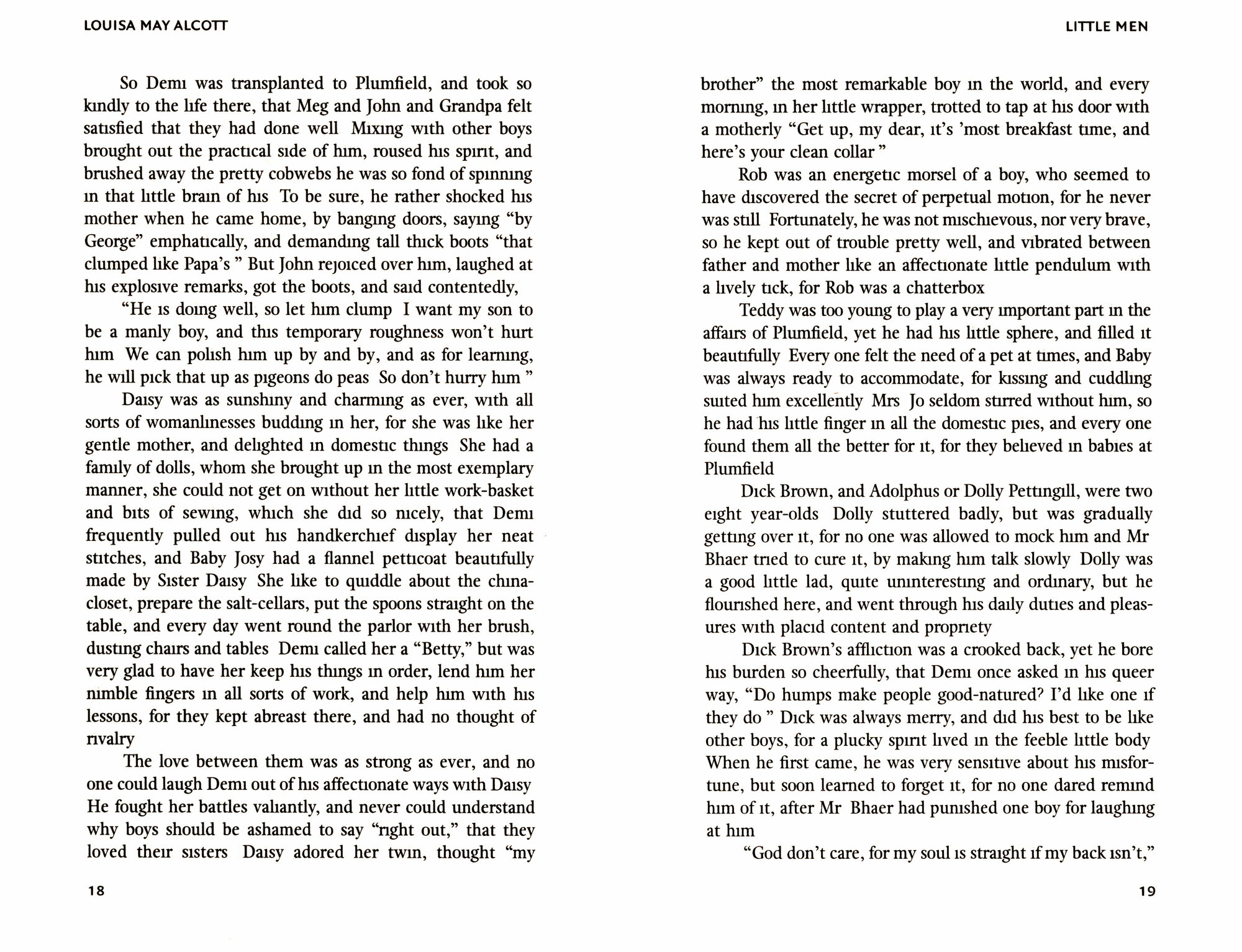 Spirited Jo March, now Mrs Bhaer, has settled into living and teaching at Plumfield boarding school, also home to a lively band of orphan boys. Jo's many pupils include Nat, a shy but talented musician, Dan, an ill-mannered troublemaker and Tommy Bangs, the school's mischievous class clown. Despite the troubles and scrapes that come with adolescent life, the lessons of kindness and gratitude taught at Plumfield prove to have a profound impact on each child.