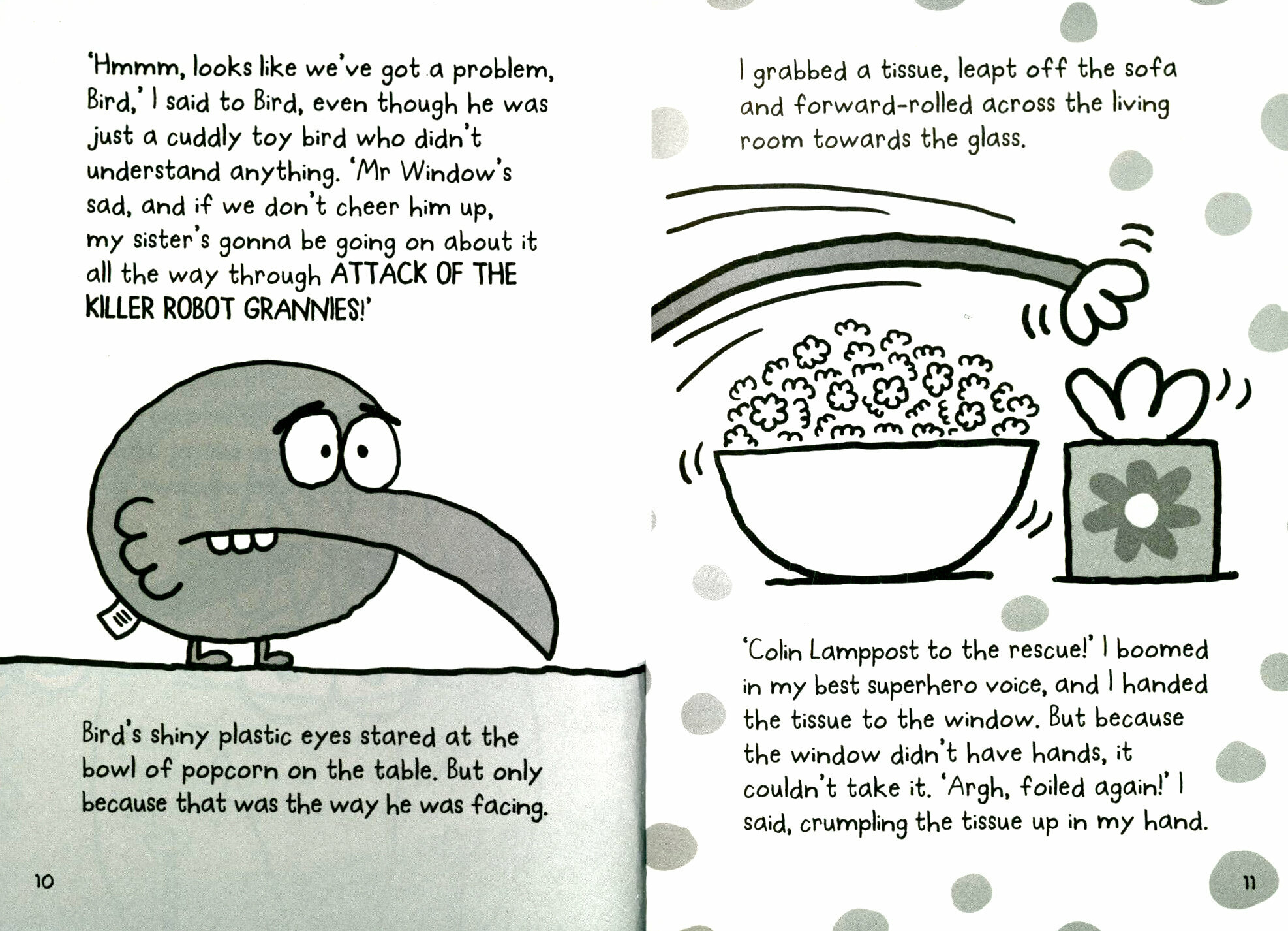 Эта история о маленьком мальчике по имени Колин Фонарный Столб, который случайно попадает в будущее. Он и его друзья должны спасать людей от бабушек-роботов-убийц и в то же время преуспеть в том, чтобы вернуться домой. Я думаю, что это действительно хорошая книга, и эта книга понравится всем, кто любит смеяться, читая веселые, бодрые жизнерадостные и захватывающие приключения. Дети будут в полном восторге. Читается легко, потому что сюжет простой, но изобретательный. Прекрасная книжка.