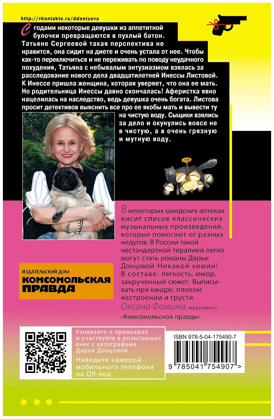 С годами некоторые девушки из аппетитной булочки превращаются в пухлый батон. Татьяне Сергеевой такая перспектива не нравится, она сидит на диете и очень устала от нее. Чтобы как-то переключиться и не переживать по поводу неудачного похудения, Татьяна с небывалым энтузиазмом взялась за расследование нового дела двадцатилетней Инессы Листовой. К Инессе пришла женщина, которая уверяет, что она ее мать. Но родительница Инессы давно скончалась! Аферистка явно нацелилась на наследство, ведь девушка очень богата. Листова просит детективов выяснить все про ее якобы мать и вывести ту на чистую воду. Сыщики взялись за дело и окунулись вовсе не в чистую, а в очень грязную и мутную воду.