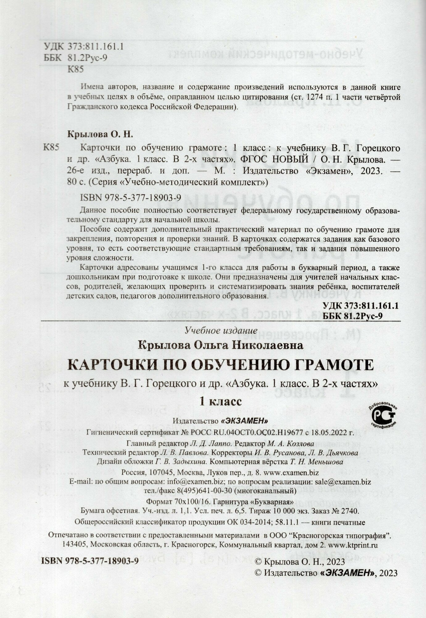 Сервис сравнения цен СкидкаГИД предлагает сравнить цены на товар «Книга: Карточки по обучению грамоте 1 класс К учебнику В Г Горецкого и др Азбука 1 класс В 2-х частях М Просвещение (Крылова Ольга Николаевна); Экзамен Издательство, 2023»