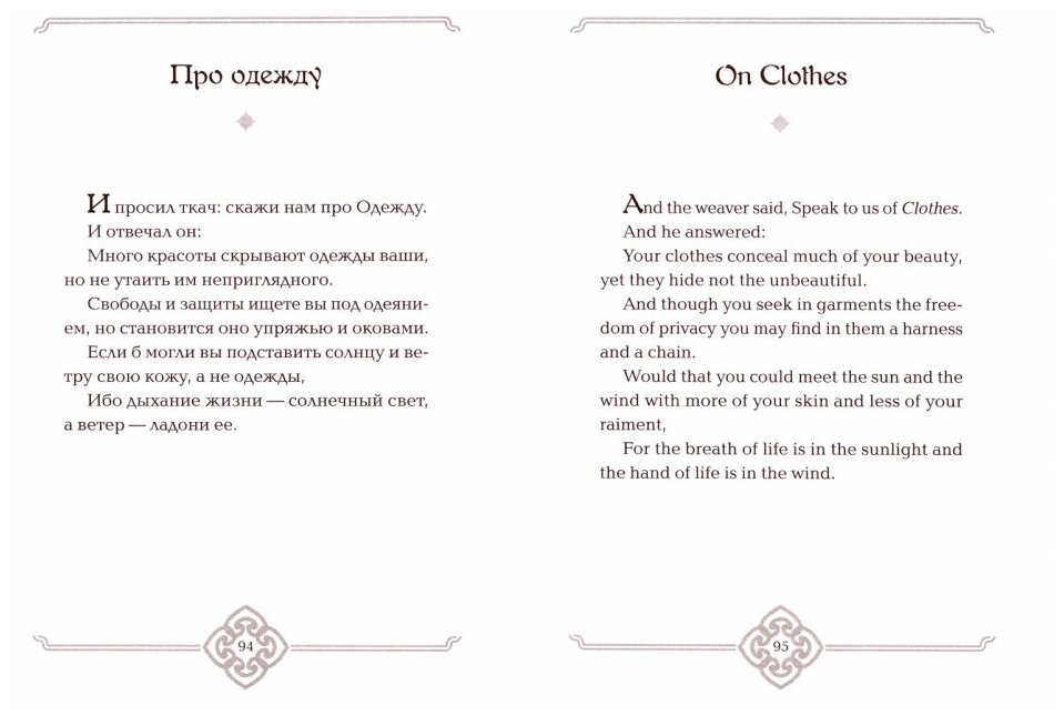 Недавно узнала про данного автора, посмотрела в ютубе озвученные стихи. Они были невероятно красивы, поучительны, мудры. Захотелось иметь физическое издание. Выбор пал на данную книгу, сочетающую и английскую и переведенную на русский язык версию. Перевод мне лично понравился. Слог красивый, складный. Однозначно рекомендую.